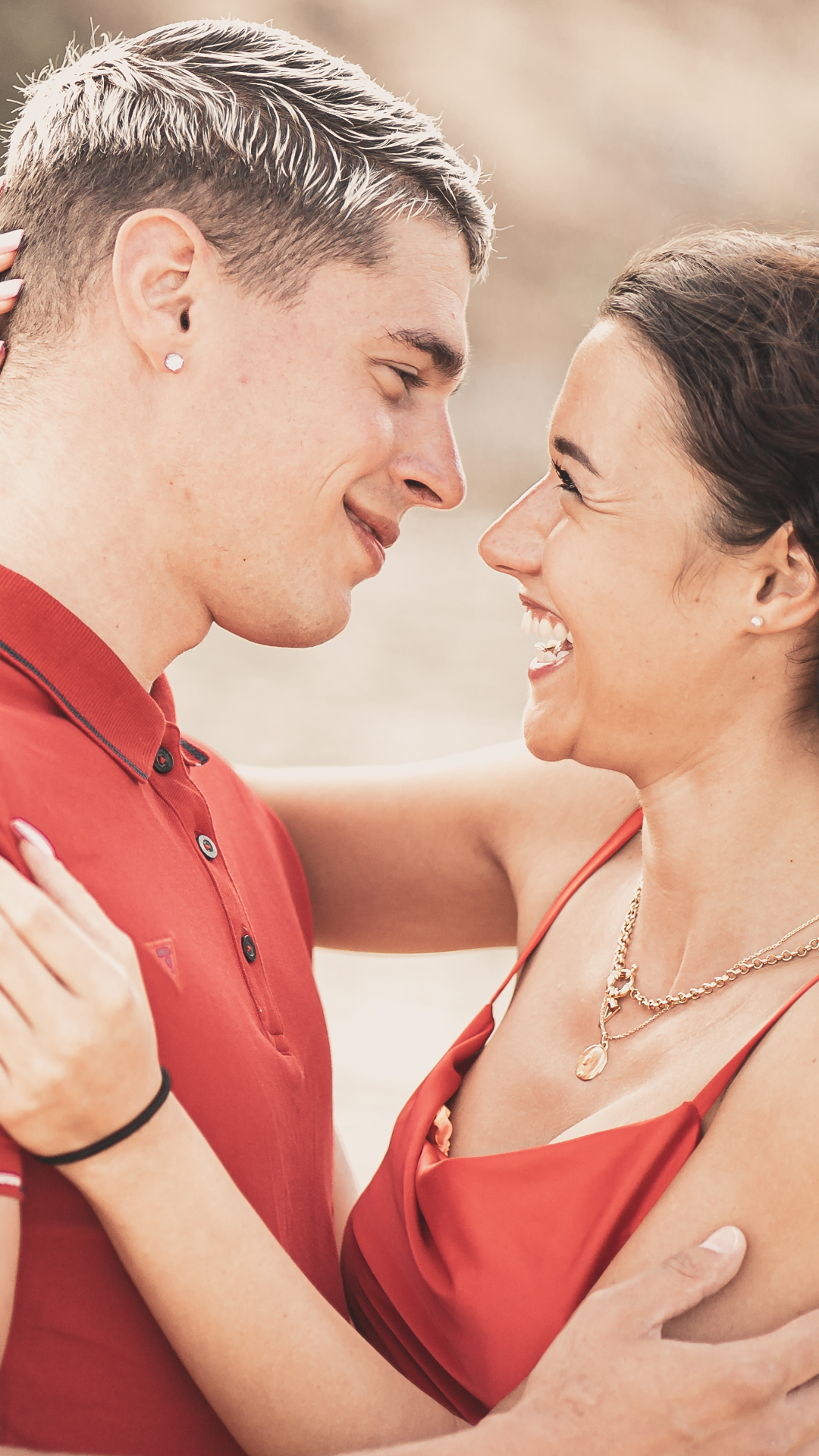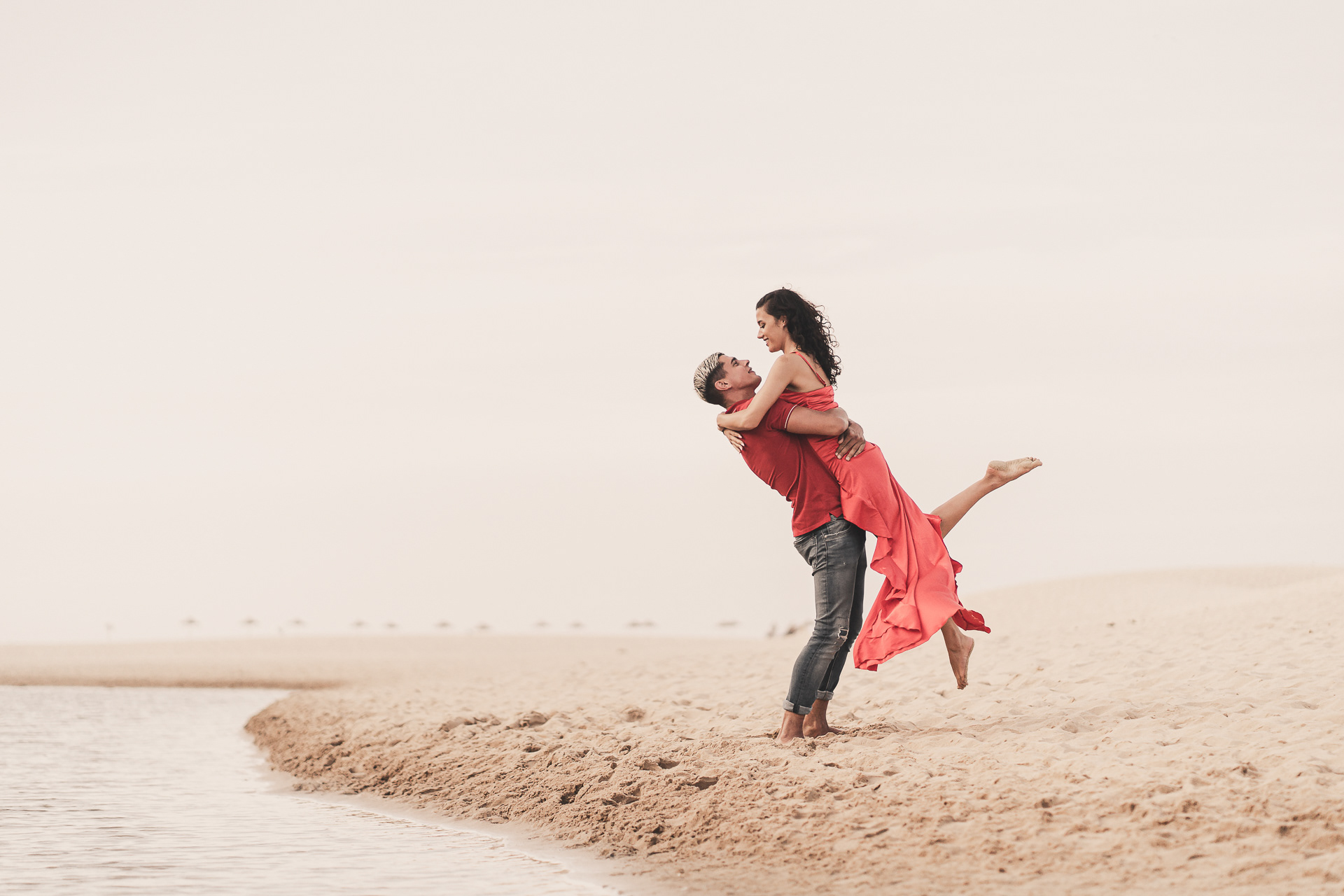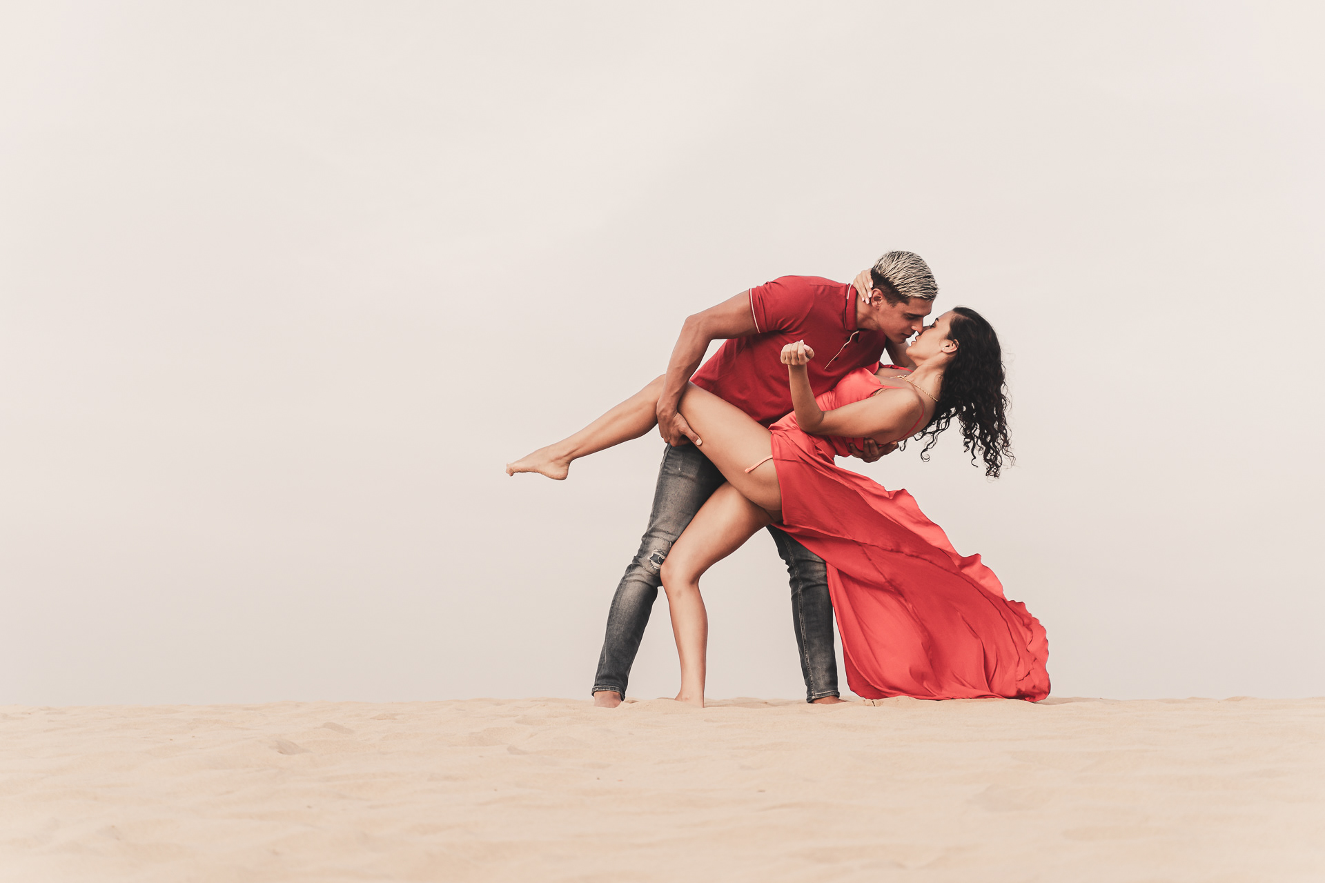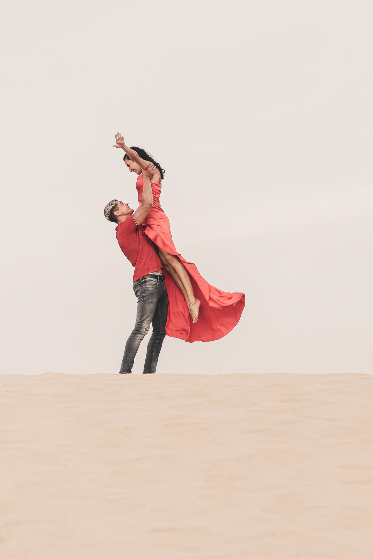 The vibrant red clothing were a key element, creating a striking contrast against the neutral tones of the sand and sky. This visual pop emphasized the playful and energetic mood of the shoot, where the couple engaged in dynamic poses, dancing, and lighthearted interactions.