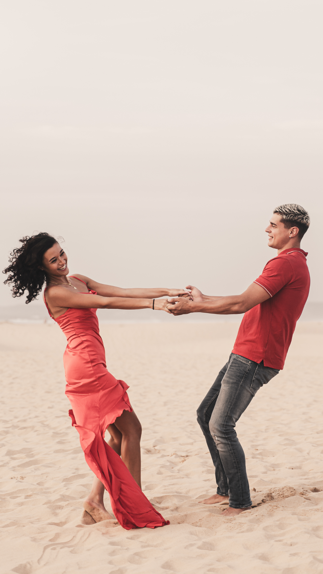 This project captures a vibrant and joyful couple photoshoot on the expansive sandy landscapes of Portugal's West Coast. Despite the overcast sky, the session focused on highlighting the couple's playful connection and genuine emotions.