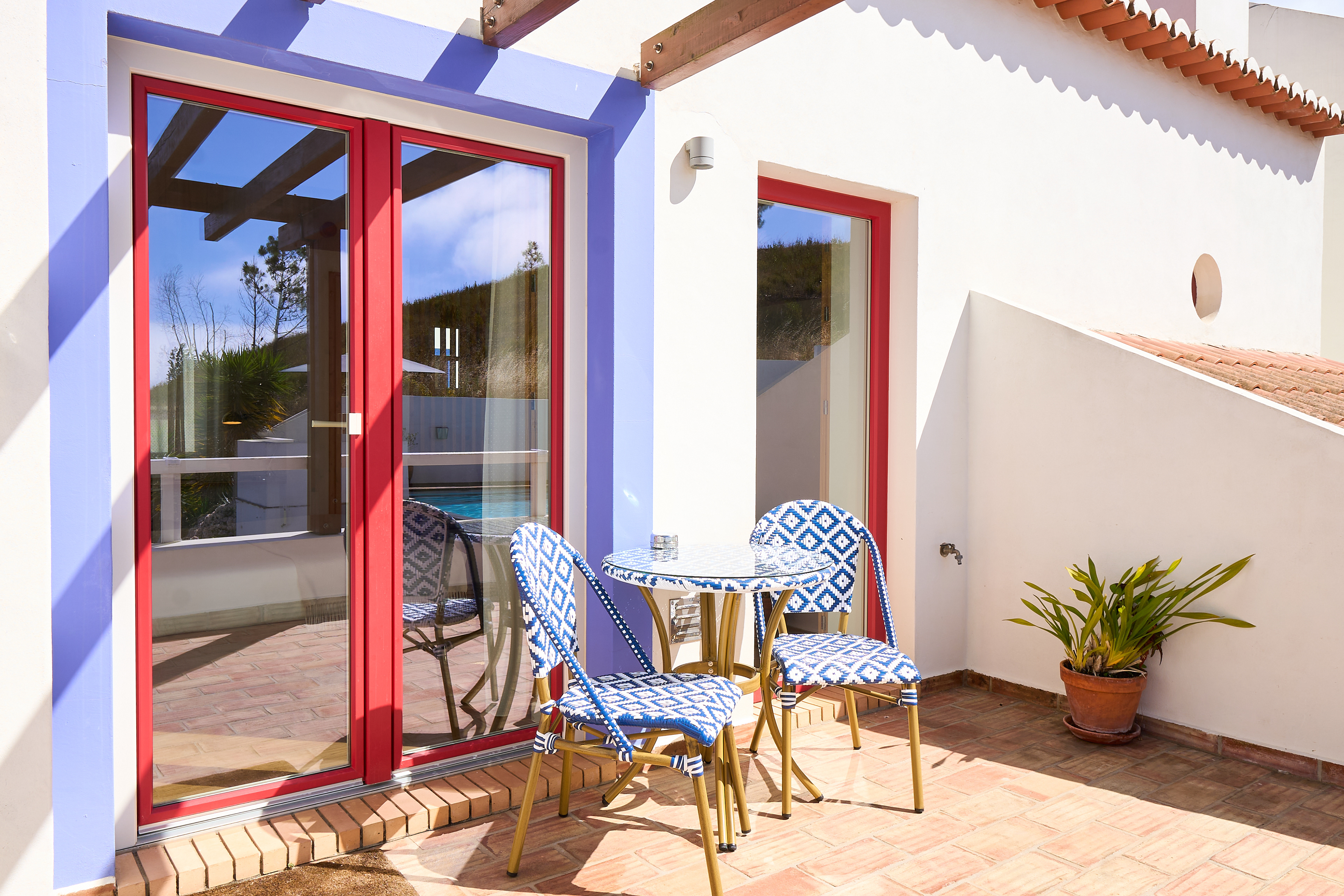 PT - A experiência culmina no terraço privado, mobilado com cadeiras tradicionais com padrões de azulejo azul e branco, o terraço oferece um local íntimo para desfrutar da vista sobre a piscina e a paisagem envolvente.