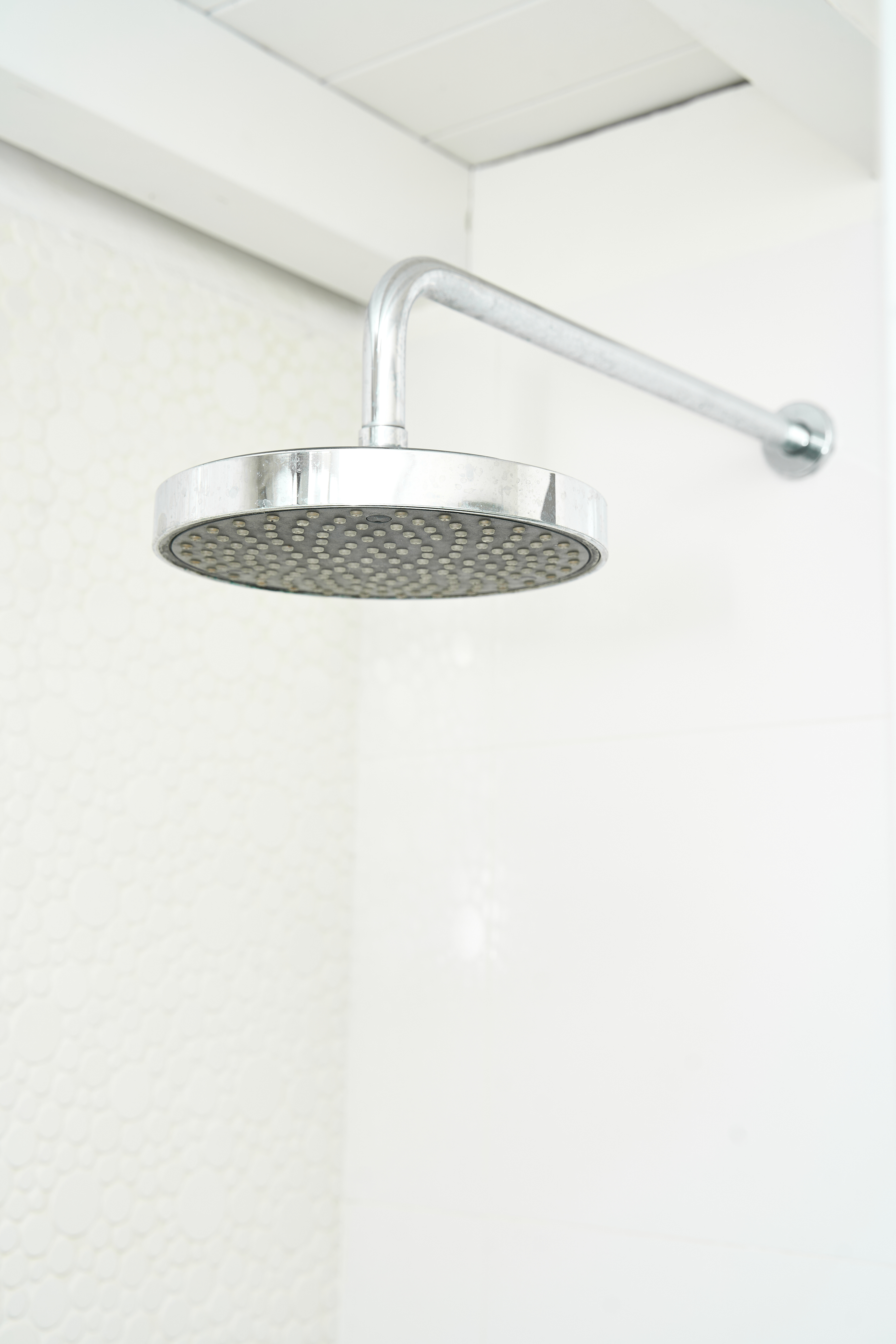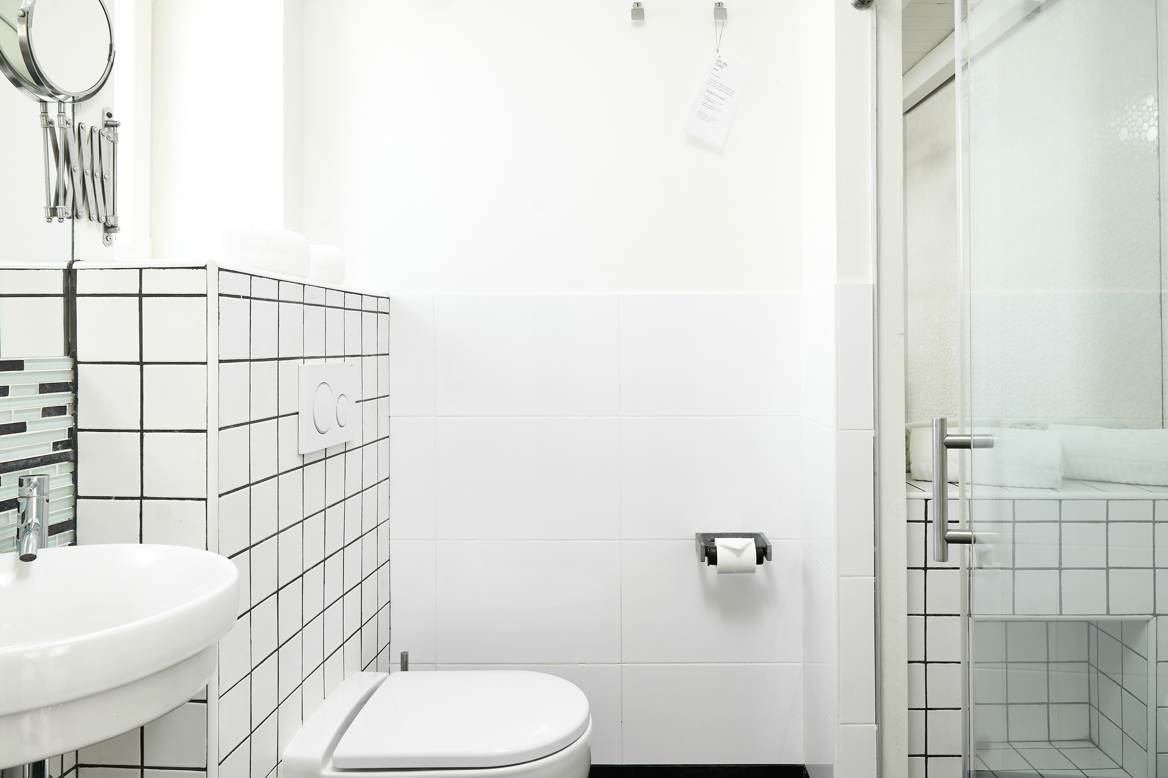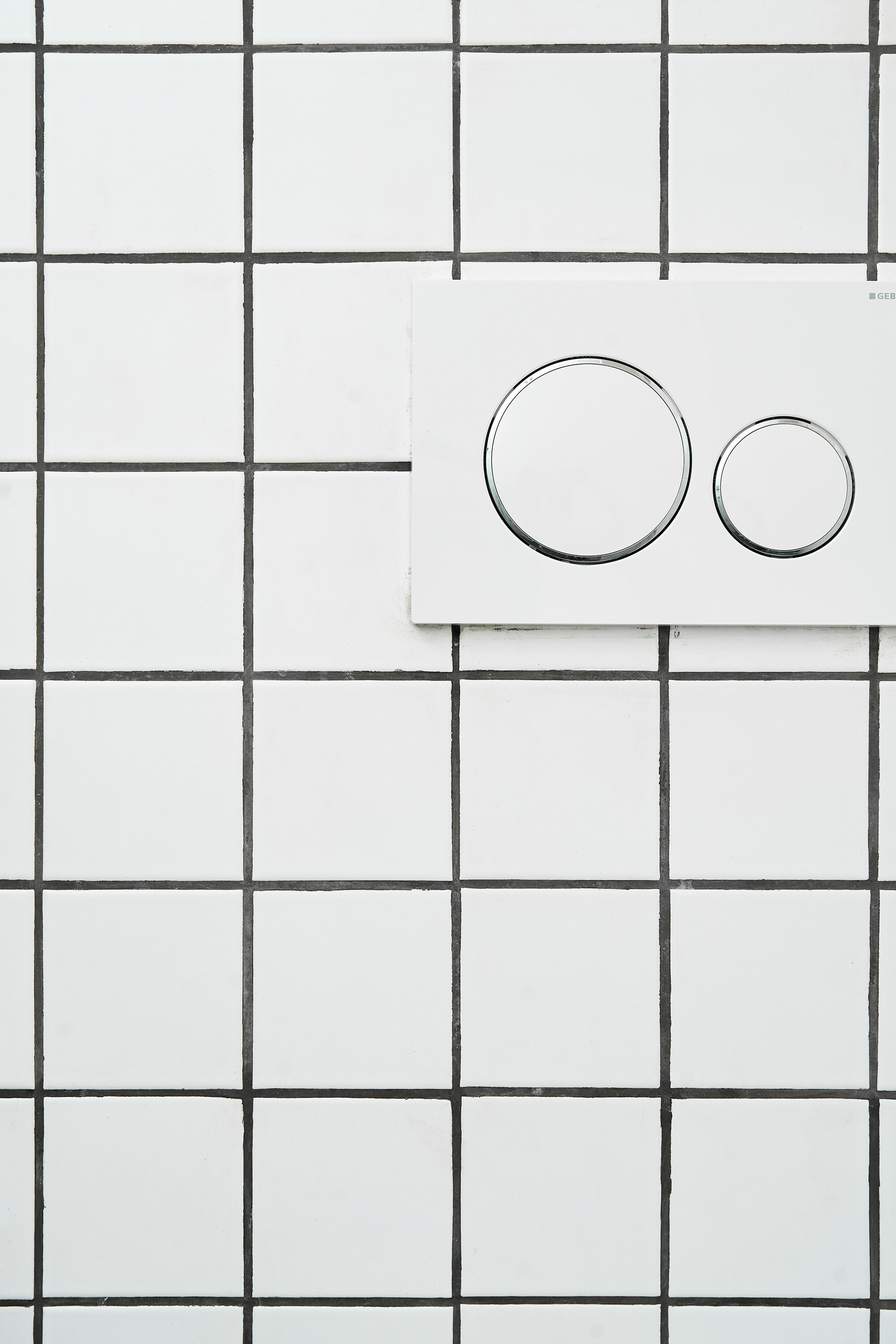 EN - The bathroom highlights minimalist geometry through a neutral palette and clean lines. The visual focus is on the intricate tile details and the clever integration of mirrored surfaces within the shower area.