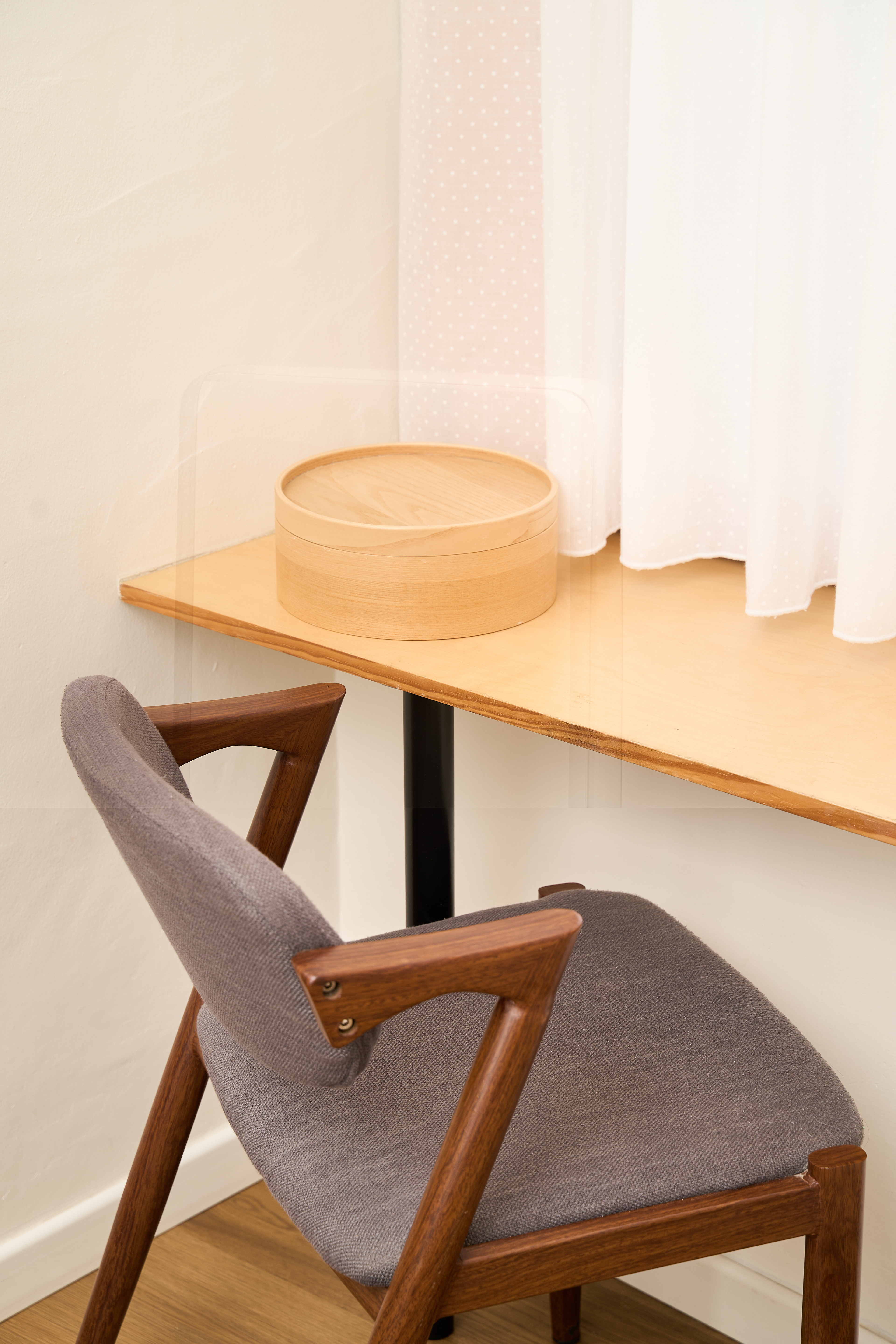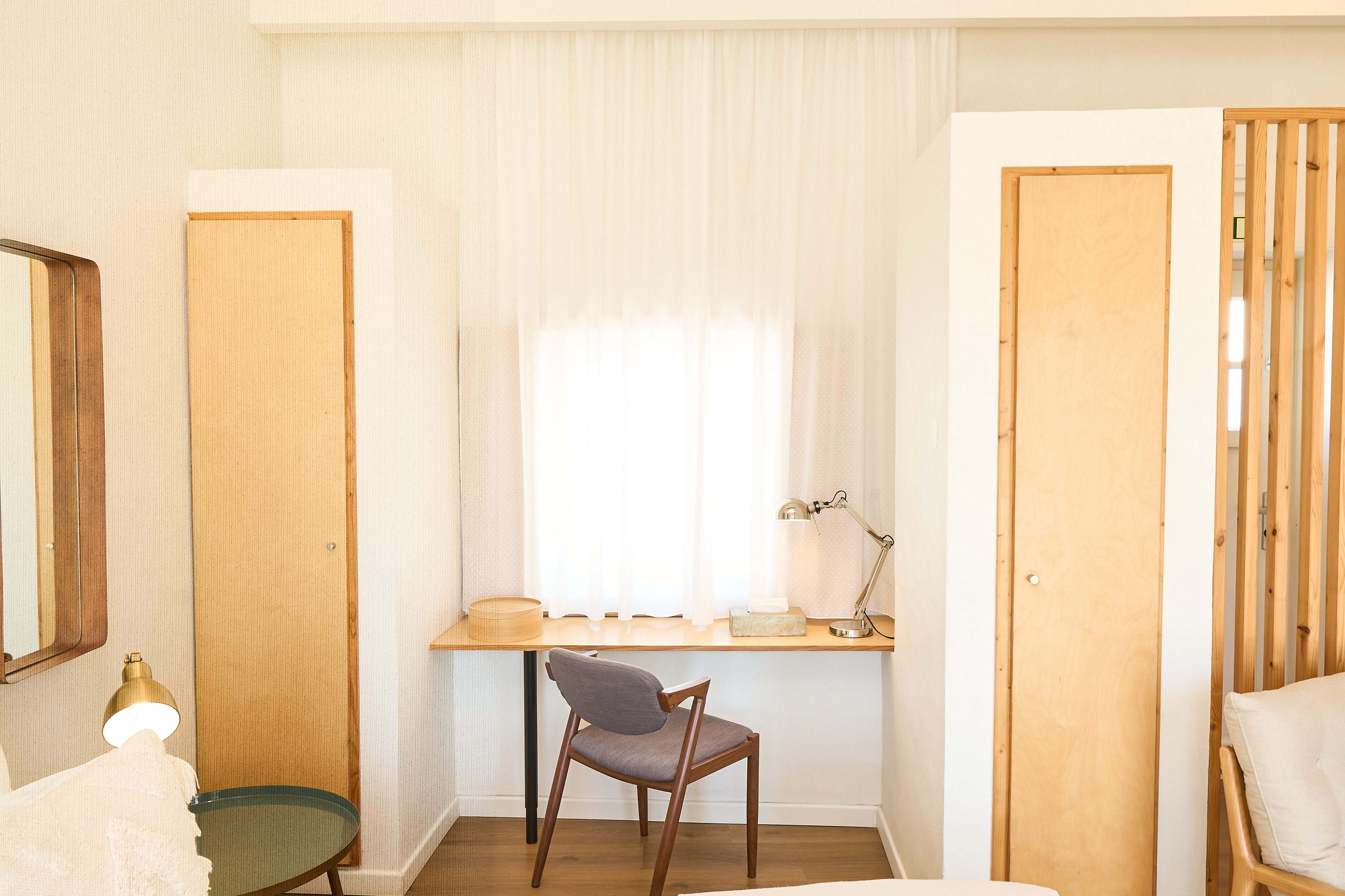 EN - Tucked between functional custom cabinetry, the workspace offers a minimalist and focused environment. This corner illustrates the studio’s clever use of space, where sleek wooden surfaces and clean lines provide a professional yet integrated area for modern travelers. The composition highlights the practical elegance of the furniture and its seamless integration into the room's design.