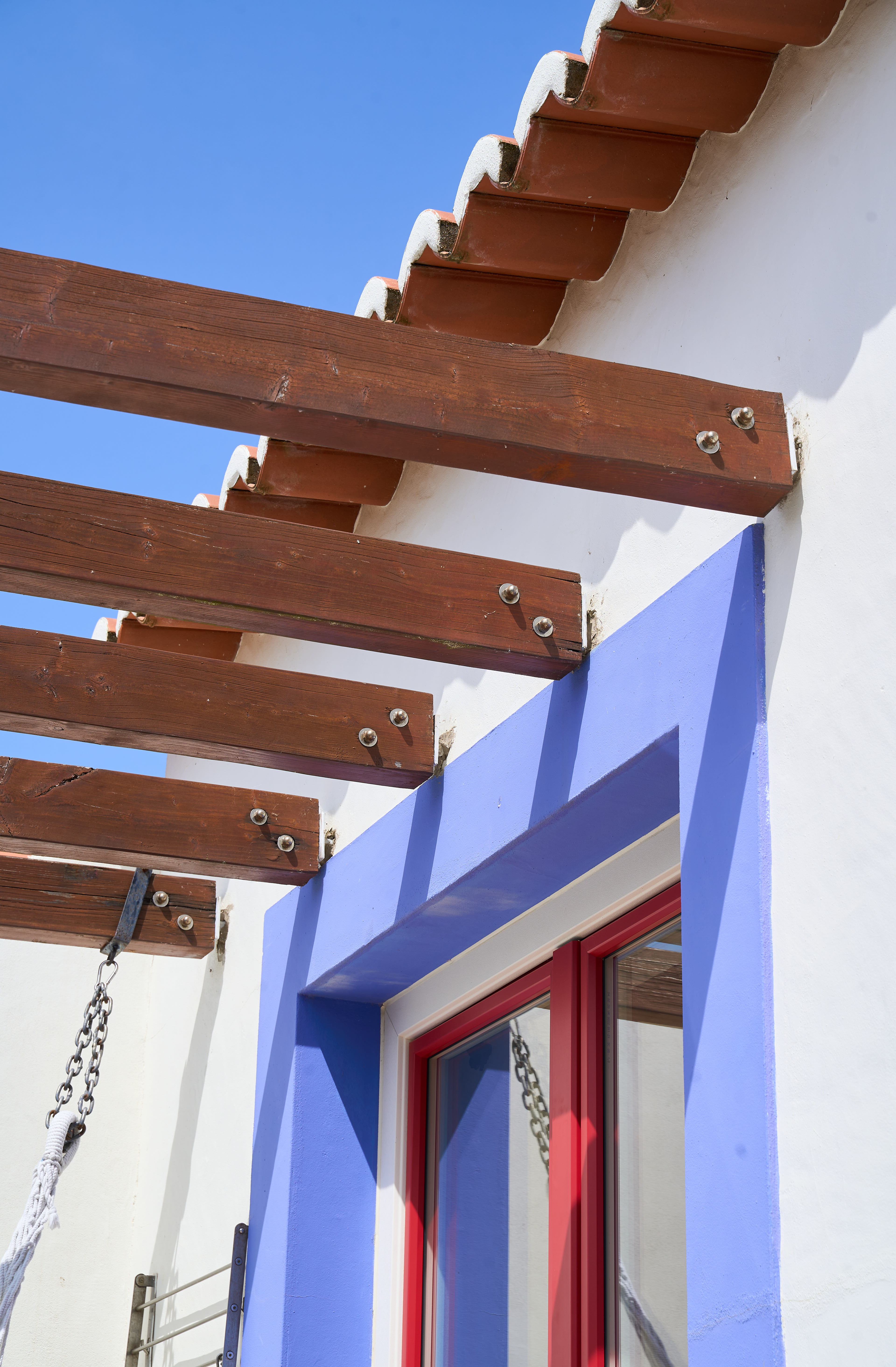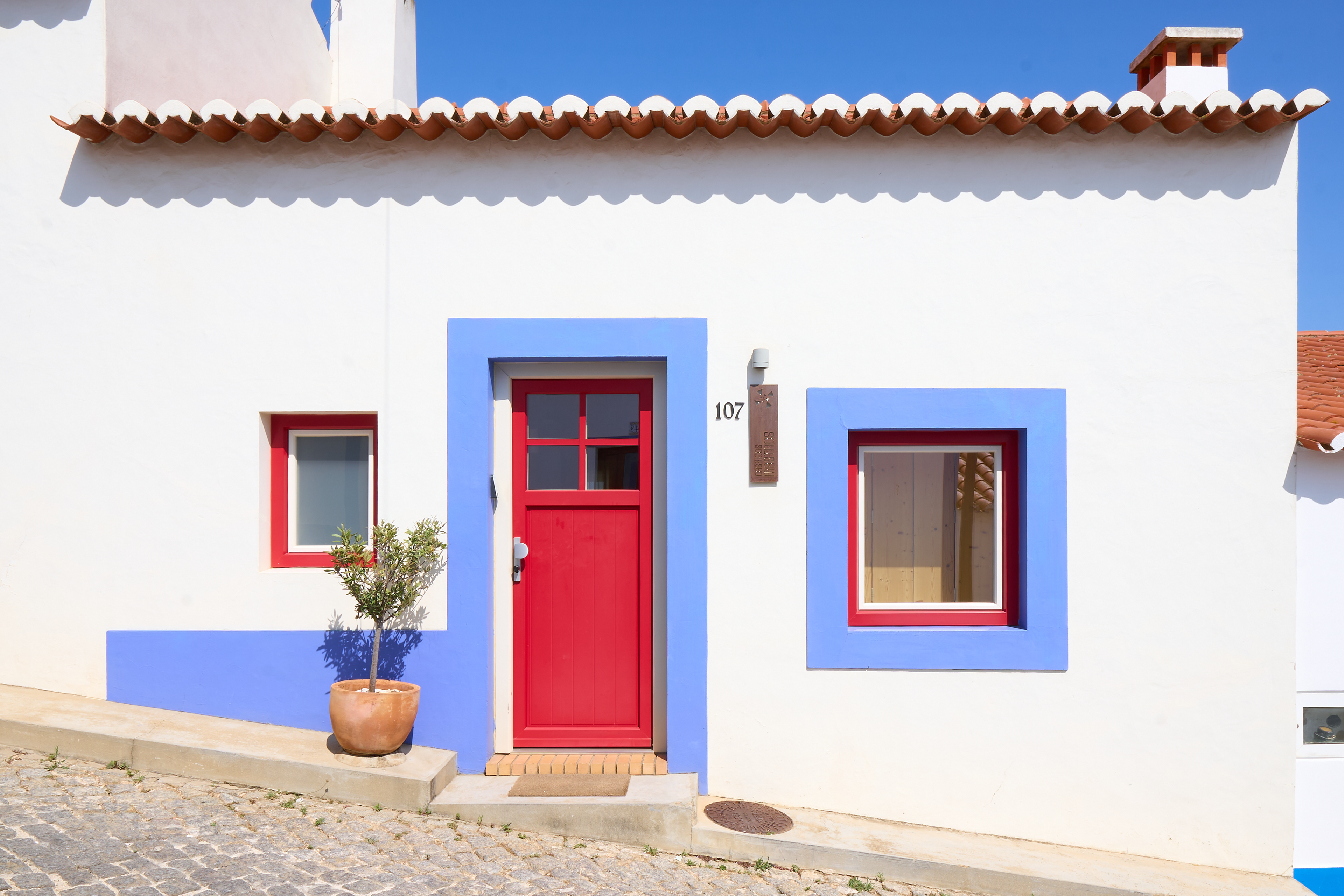 EN - The exterior captures the quintessential Portuguese charm with its pristine white walls, vibrant violet trims, and classic orange roof tiles. Inside, the space evolves into a high-end sanctuary.