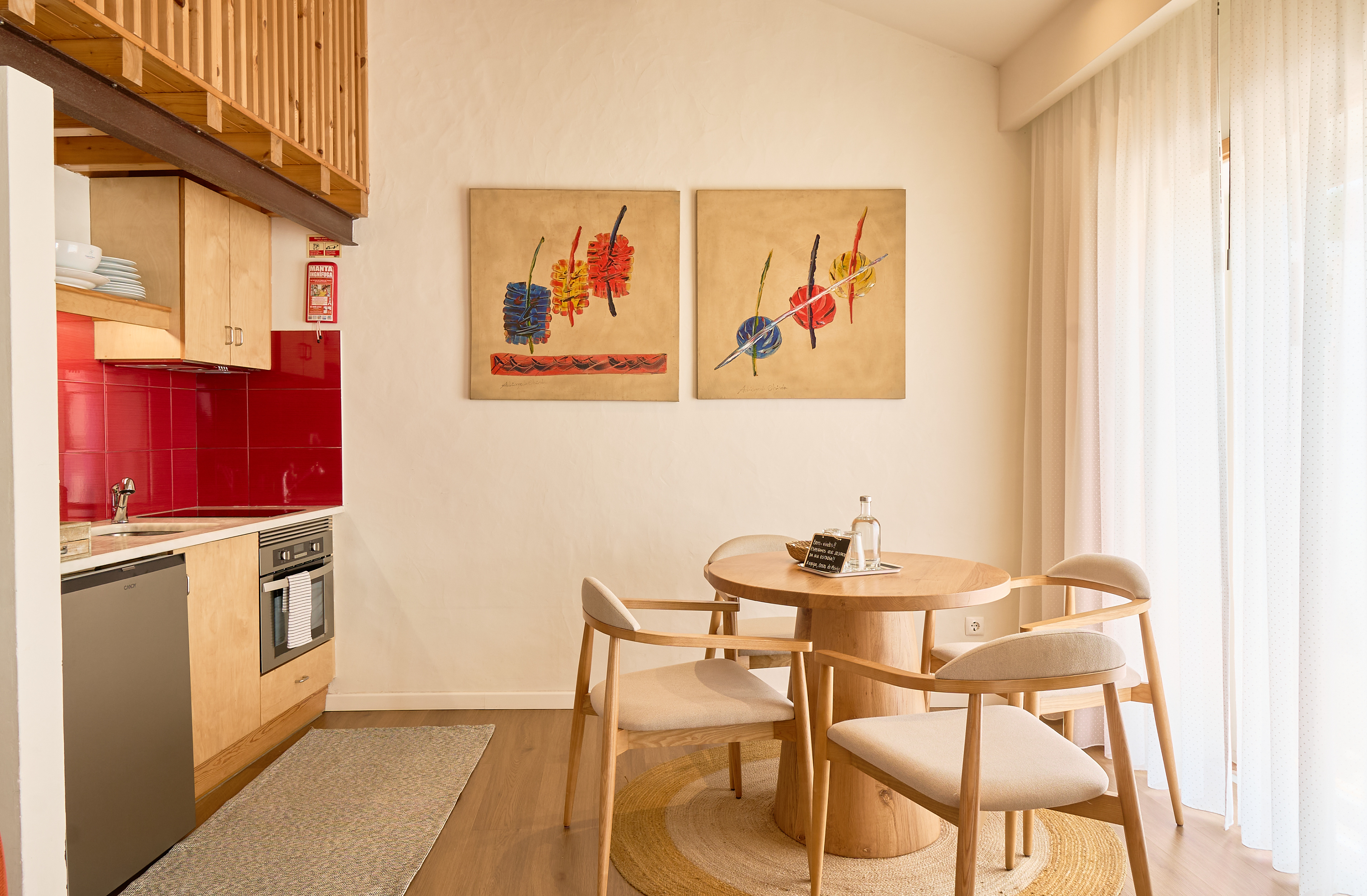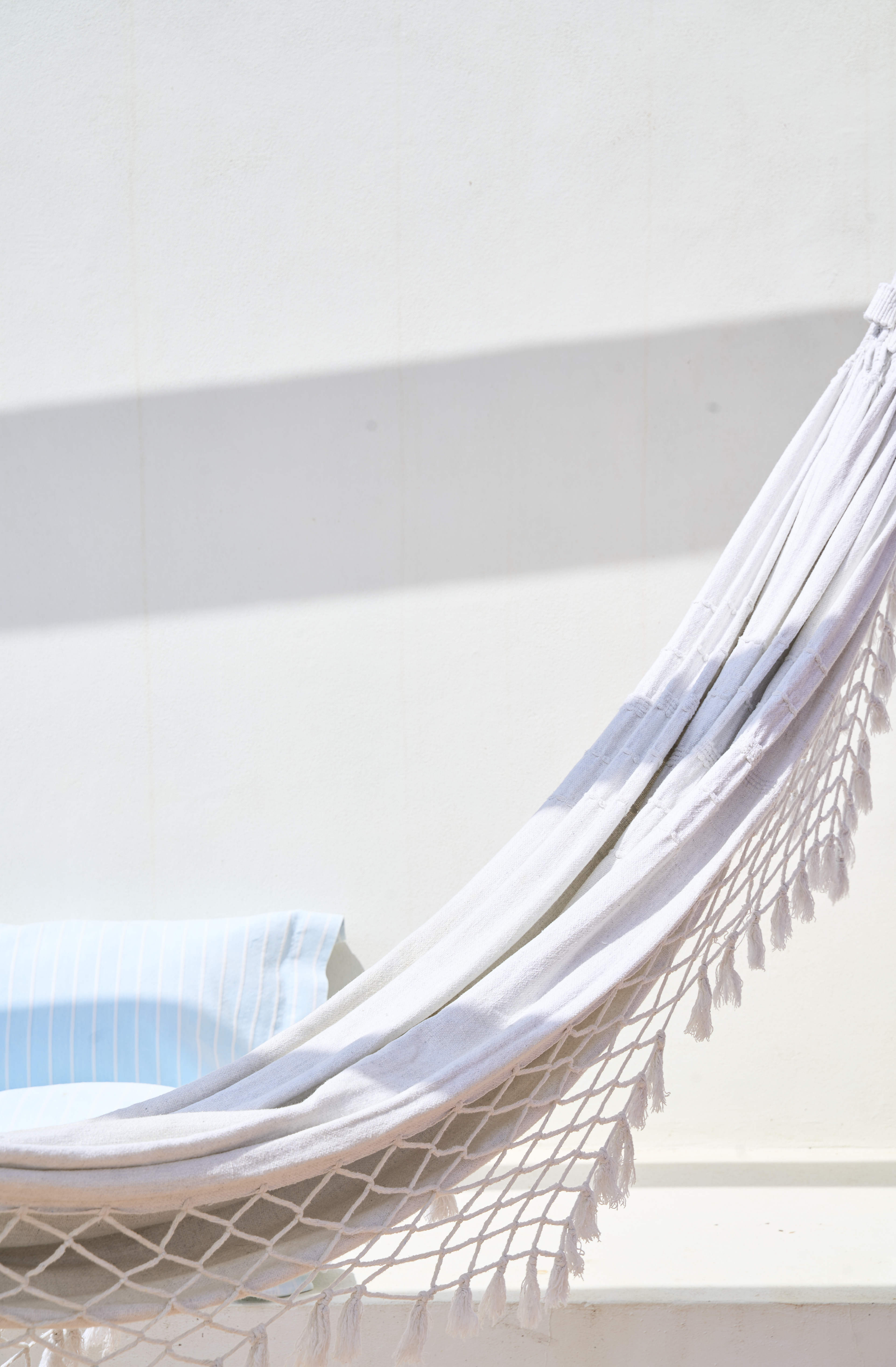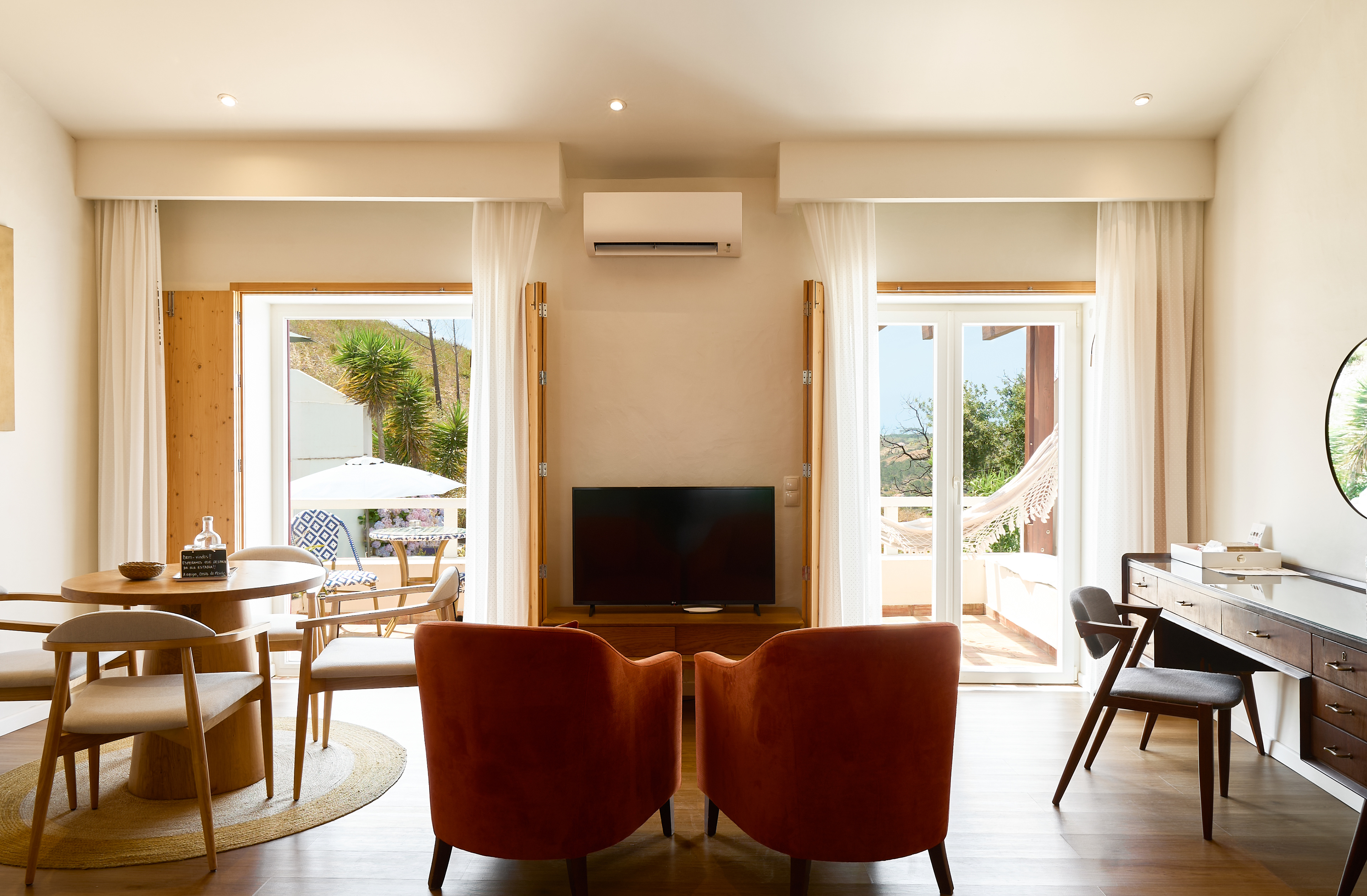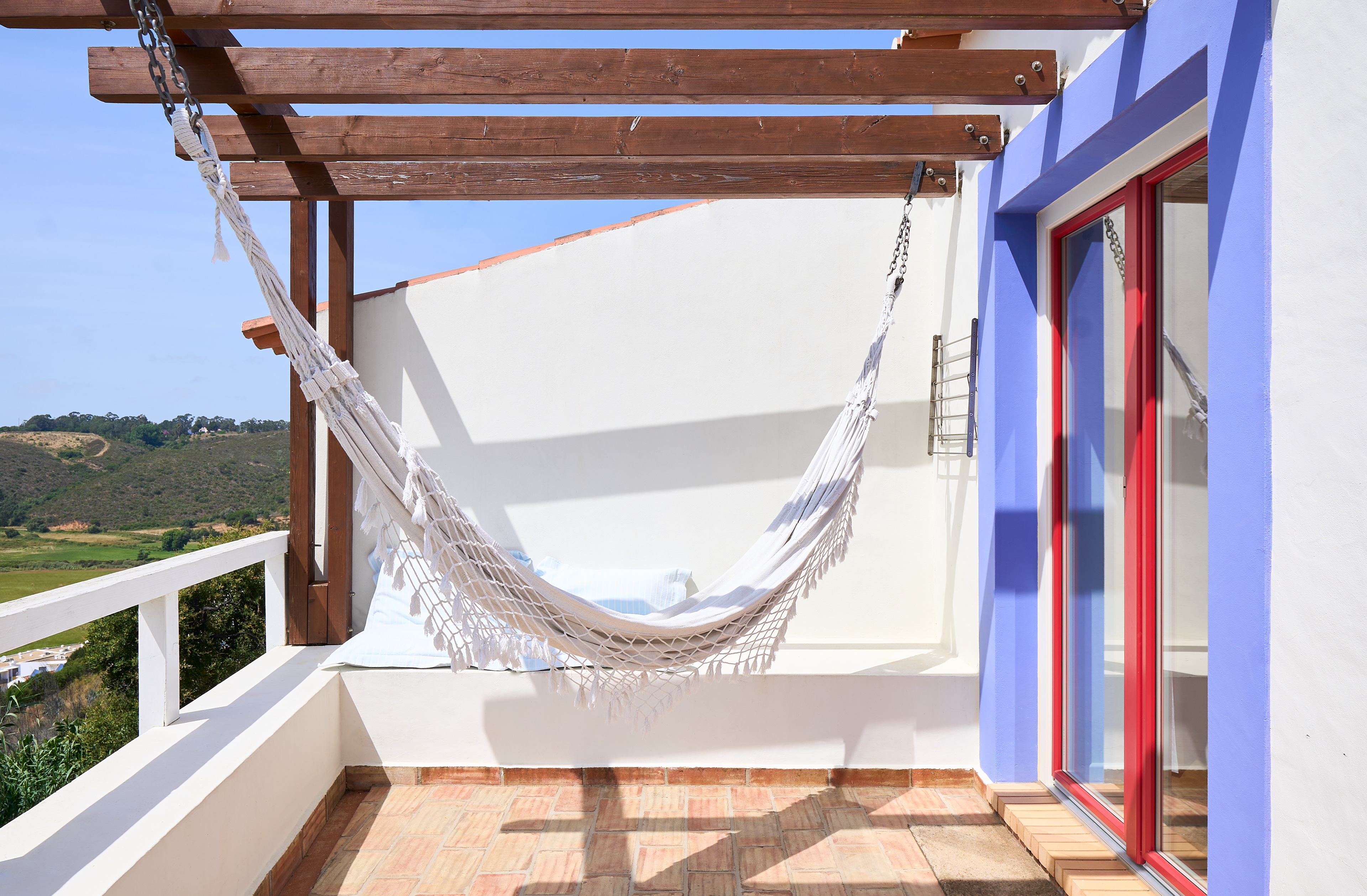 EN - The experience concludes on the private terrace, a perfect integration of indoor and outdoor living. Equipped with a dining spot and a hammock, it offers an elevated view over the Casas do Moinho swimming pool and relaxation area. This space was captured to evoke the slow pace and Mediterranean serenity of village life.