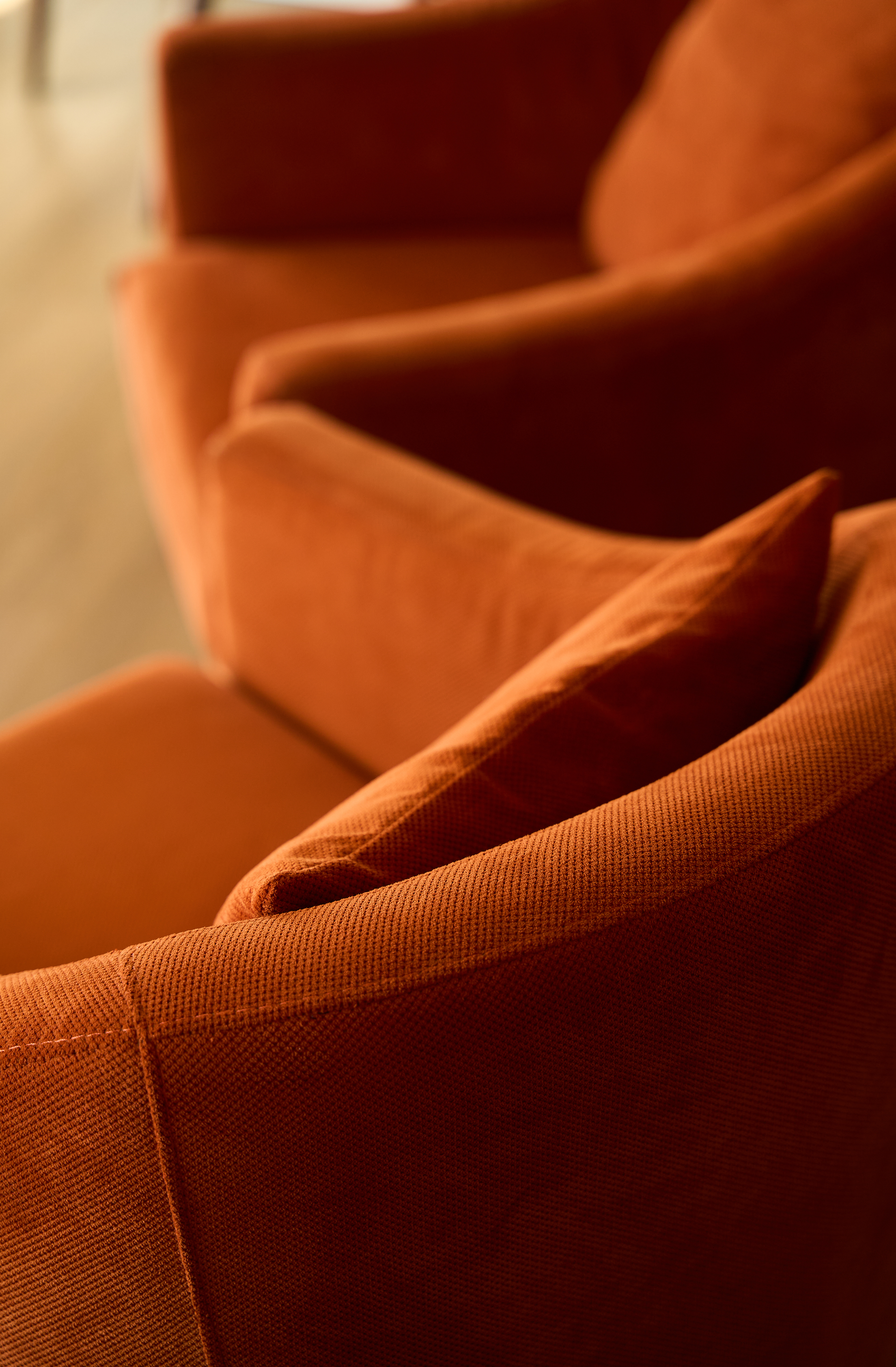 PT - A área de estar apresenta dois cadeirões cor de laranja marcantes que ligam perfeitamente o conforto interior com o exterior vibrante e mediterrânico. Posicionado junto às grandes portas de vidro, este canto oferece acesso direto e uma vista fluida para o terraço privado, inundando o interior com luz natural.