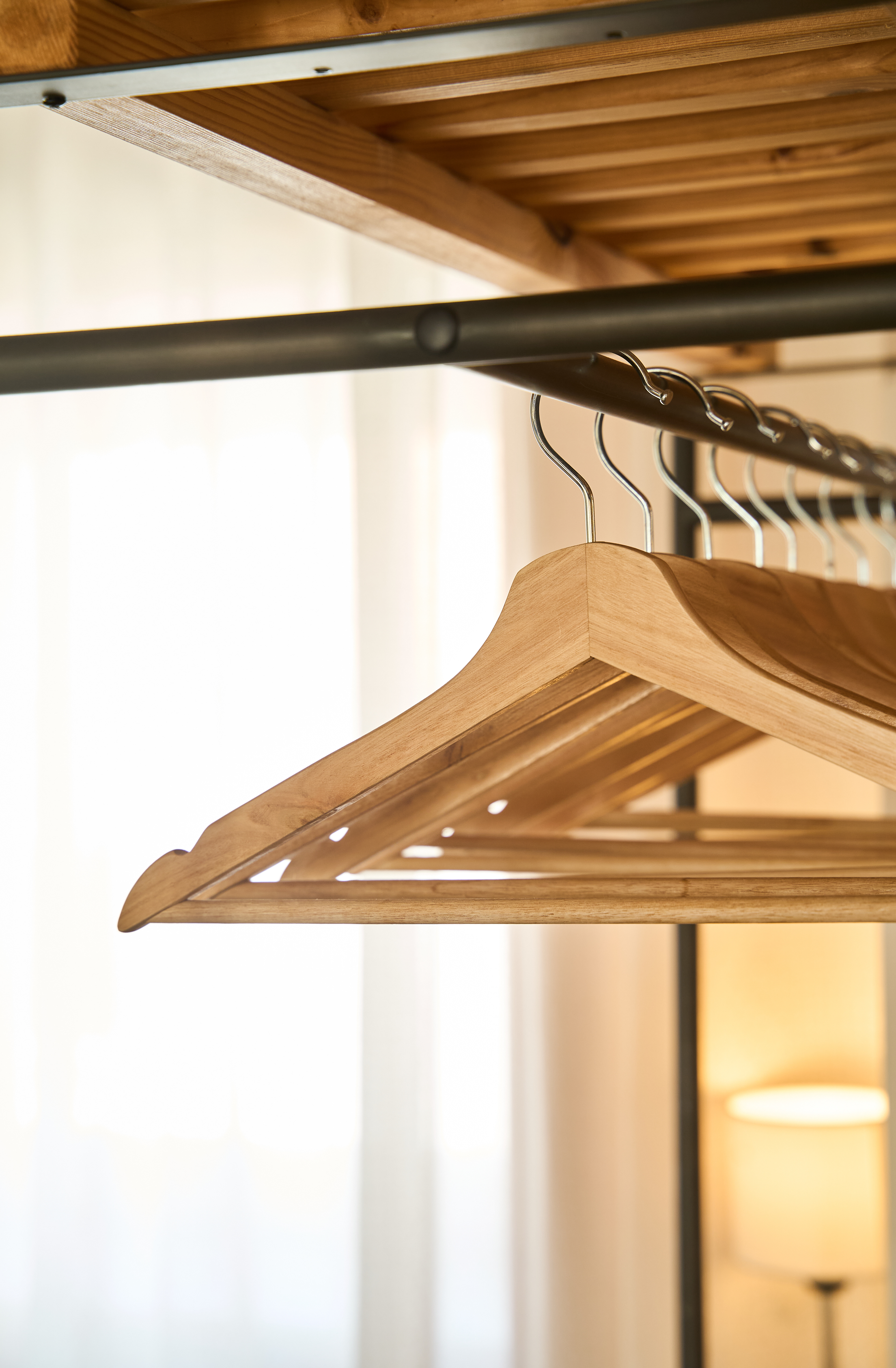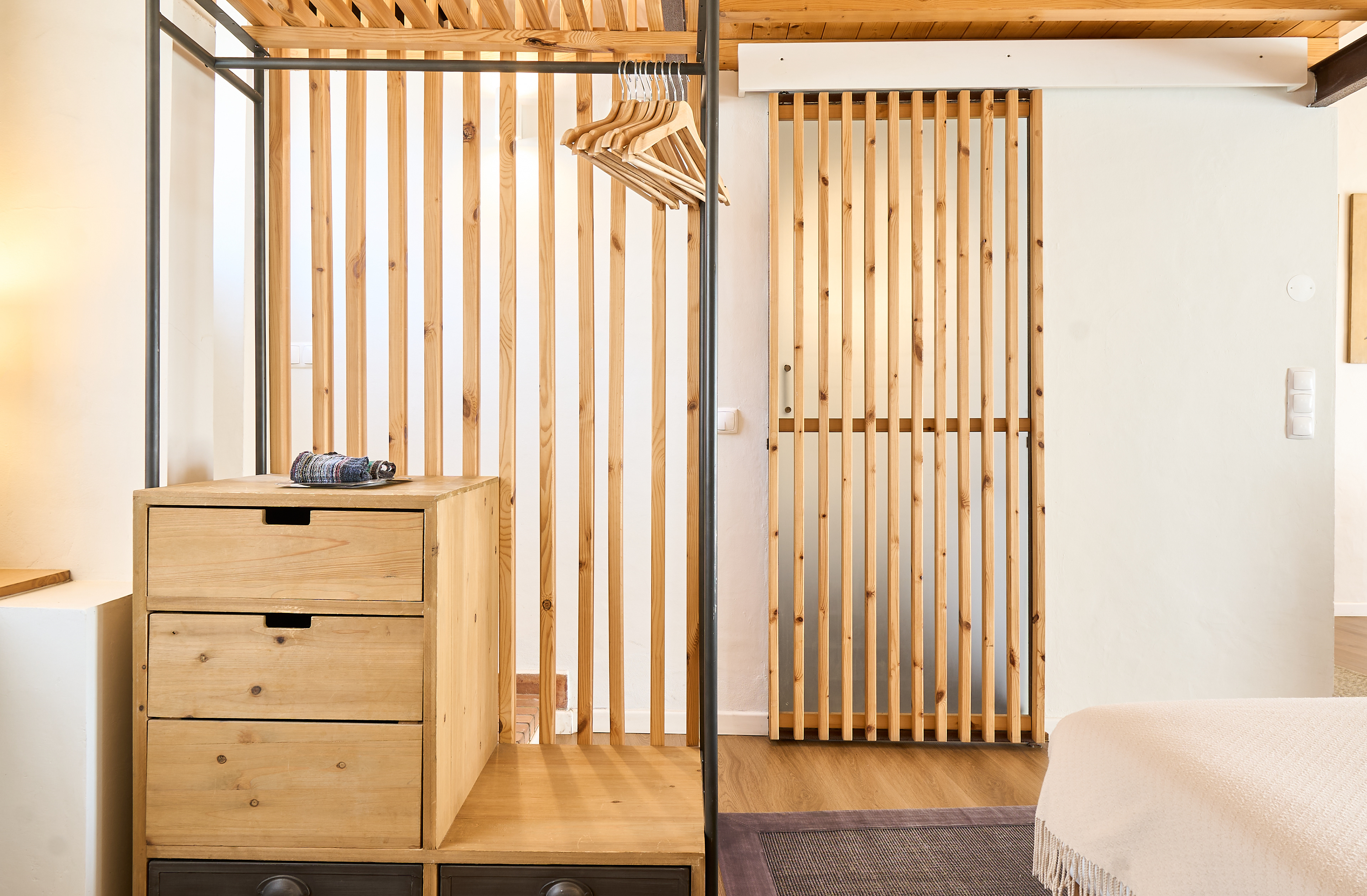 EN - The wardrobe and bathroom entrance are seamlessly integrated through bespoke slatted wood designs. I captured these elements to highlight the rhythmic vertical lines and the natural warmth they bring to the contemporary structure, creating a sophisticated yet organic transition between spaces.