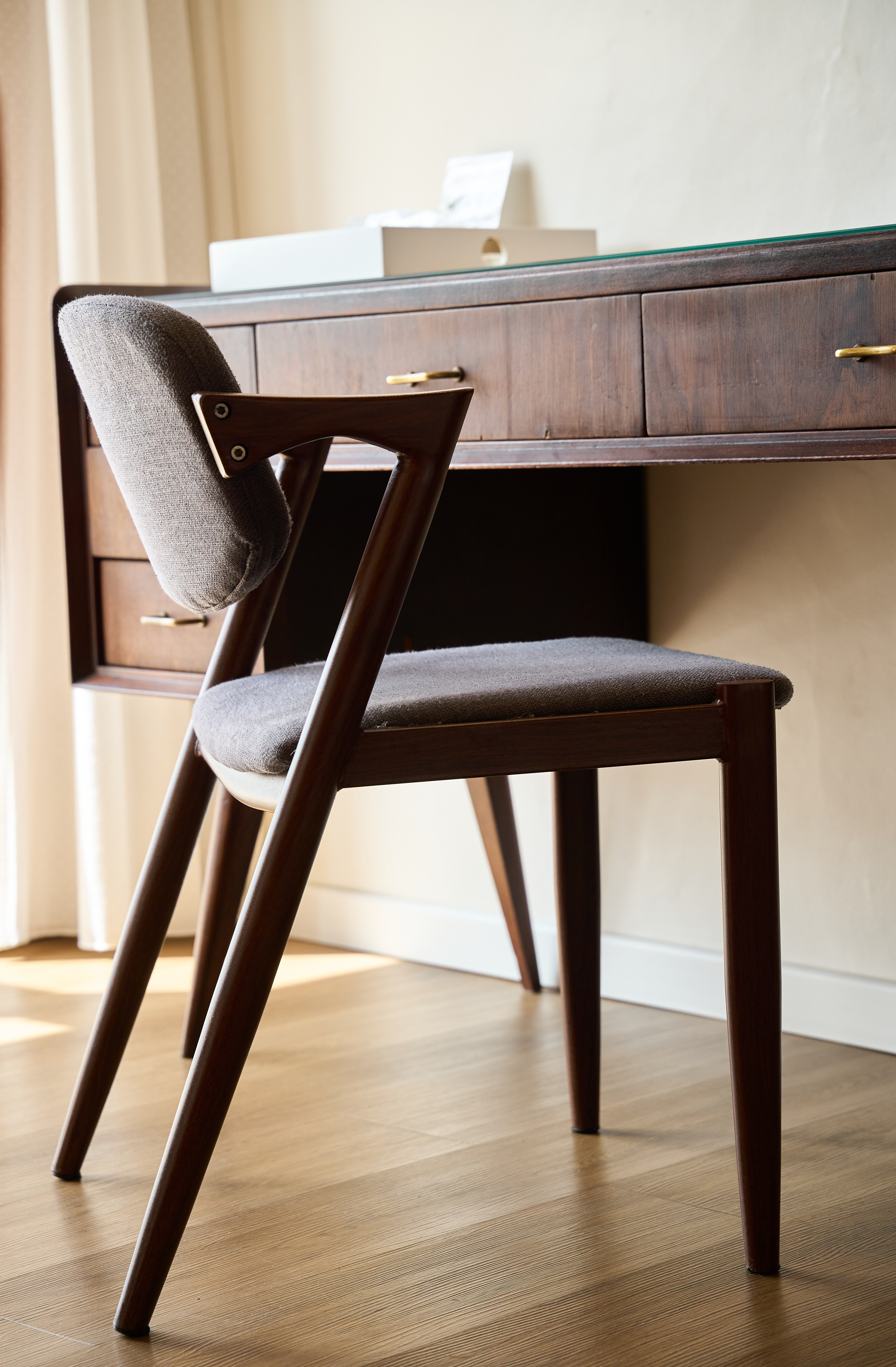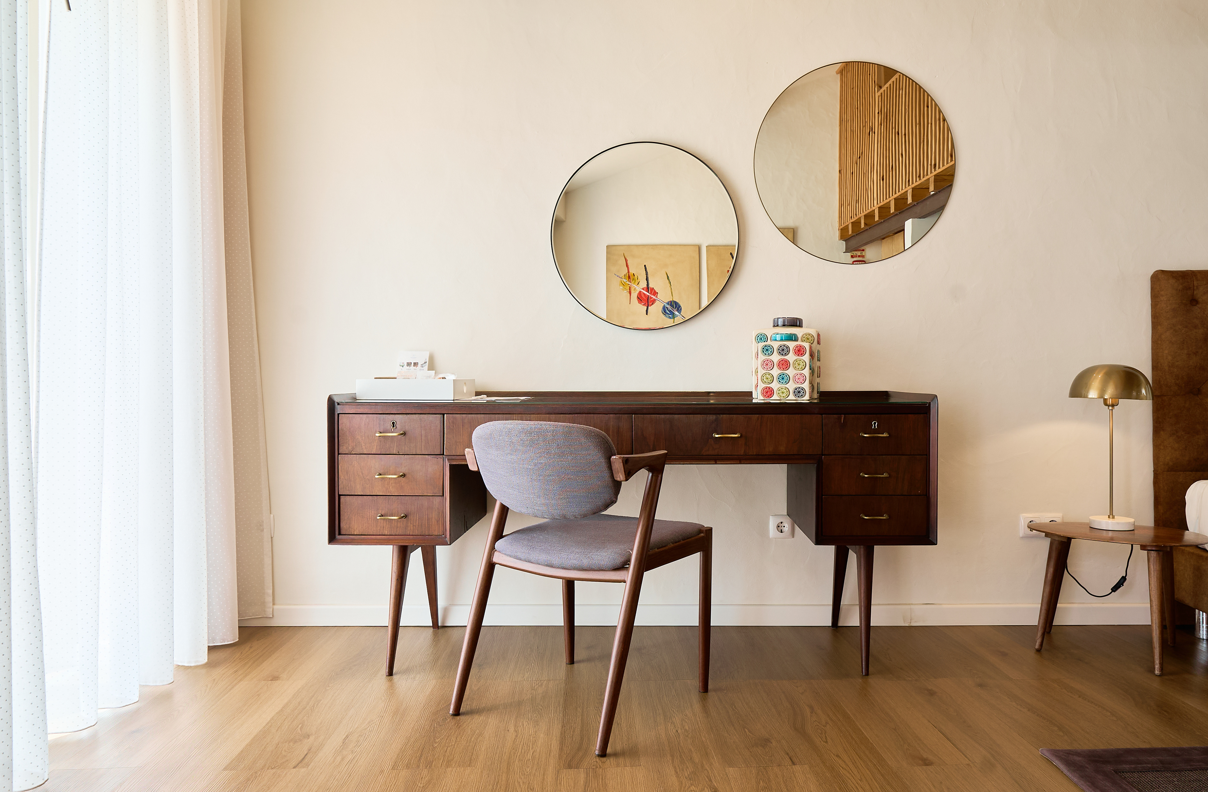 PT - Uma característica marcante do rés-do-chão é a coiffeuse minimalista. Este design inteligente funciona também como uma secretária elegante, complementada por espelhos redondos. Foquei-me em como a luz natural da janela interage com as linhas arquitetónicas limpas deste espaço, fundindo utilidade com uma estética de gama alta.