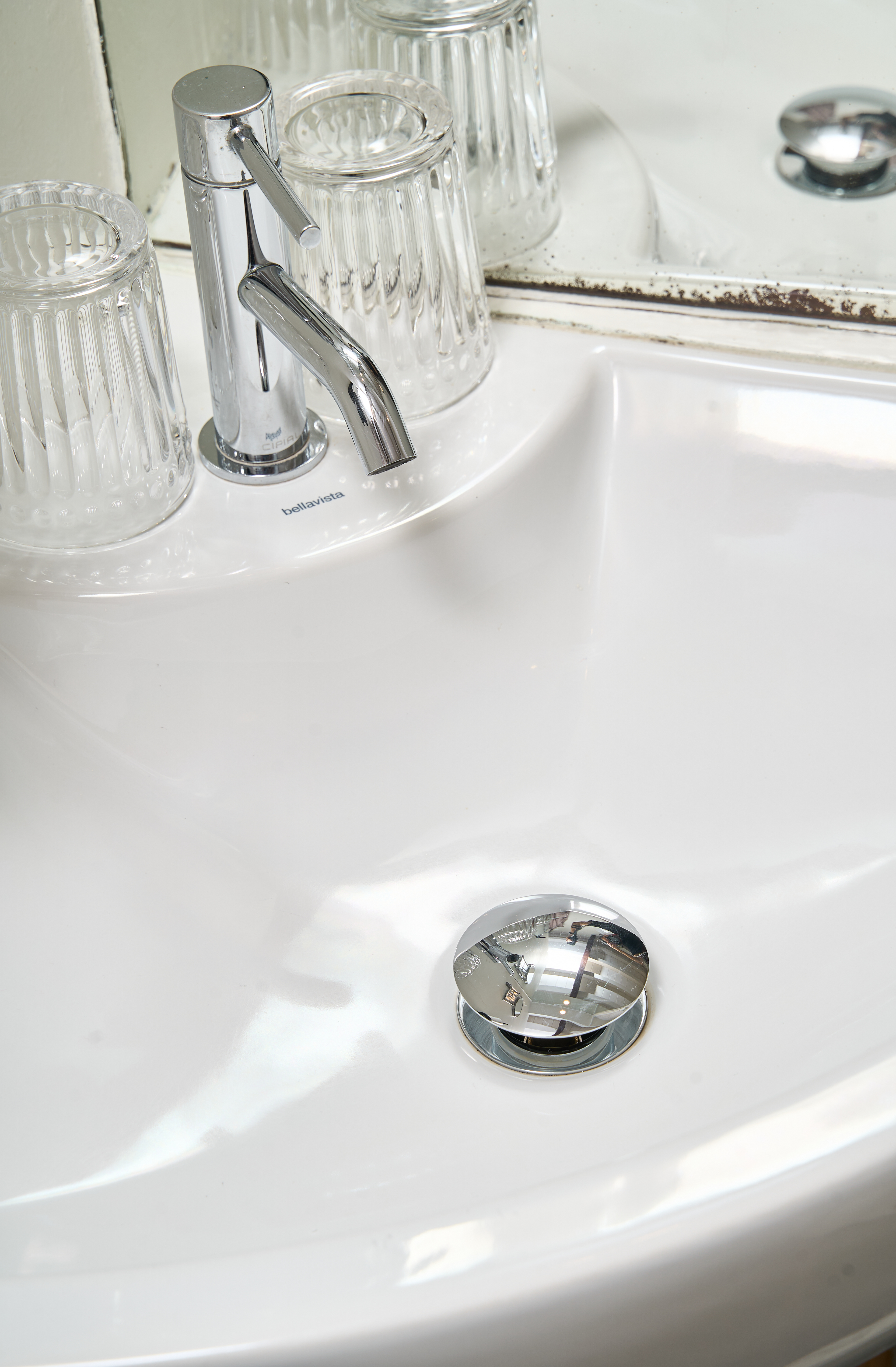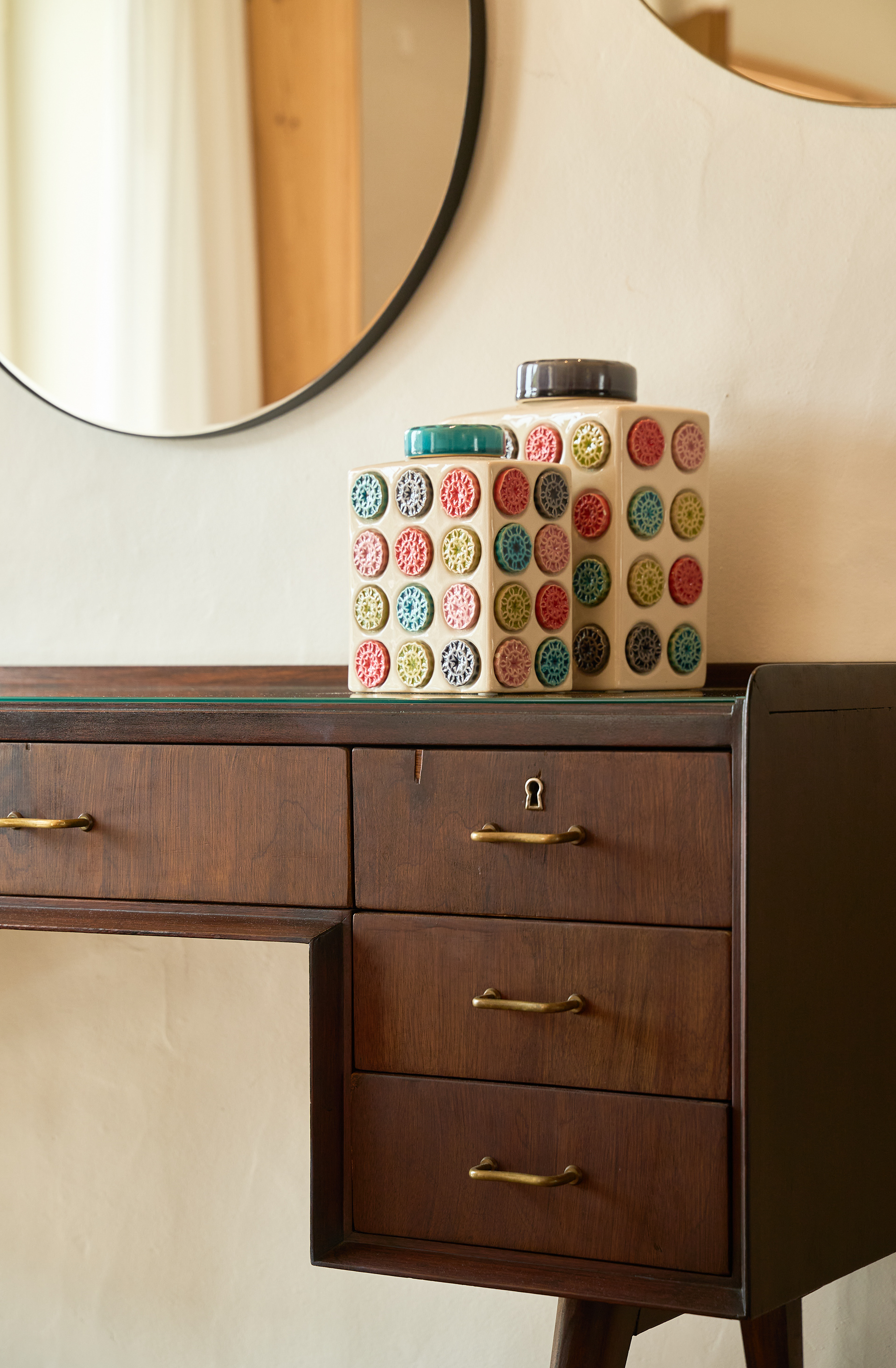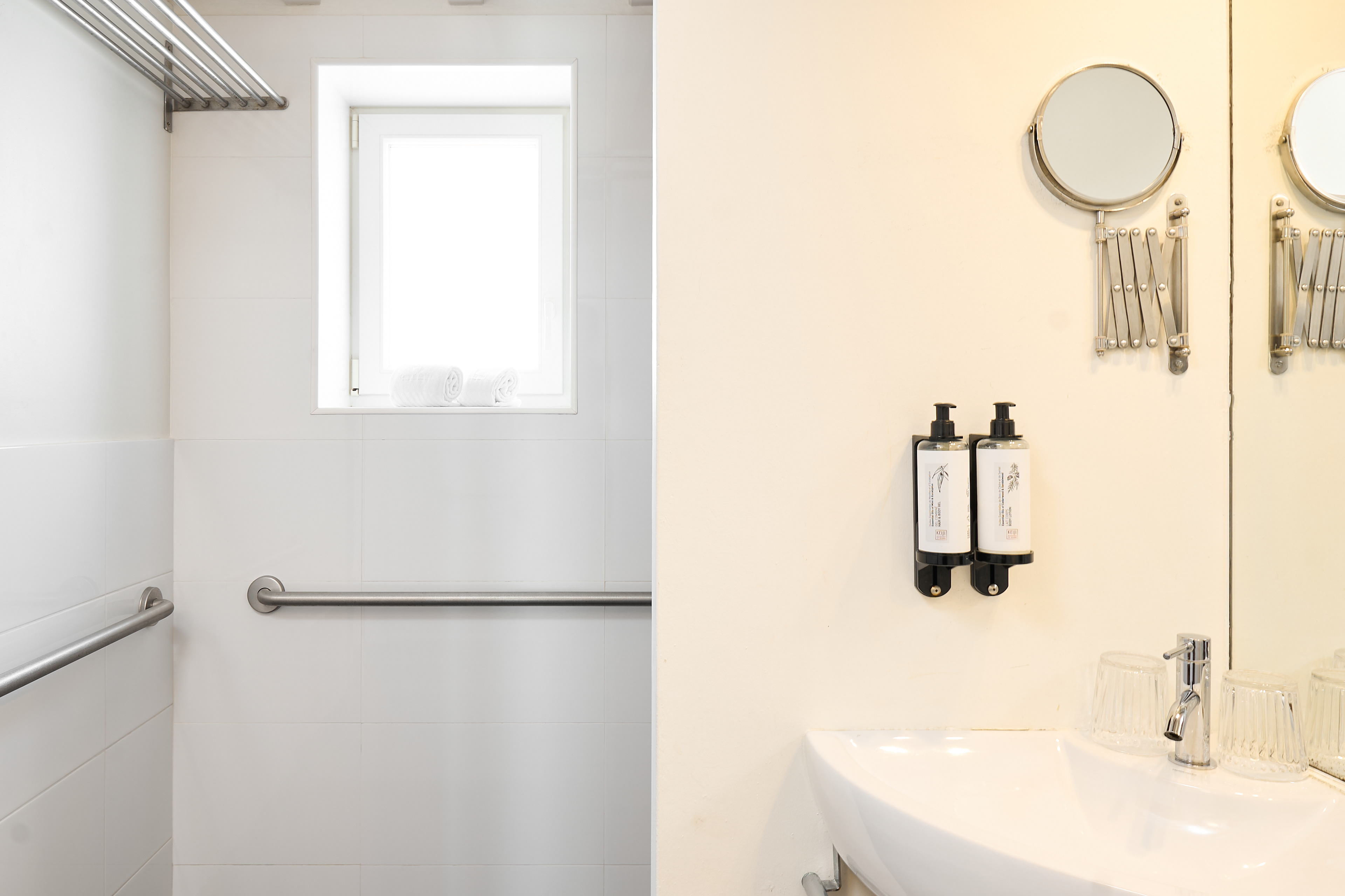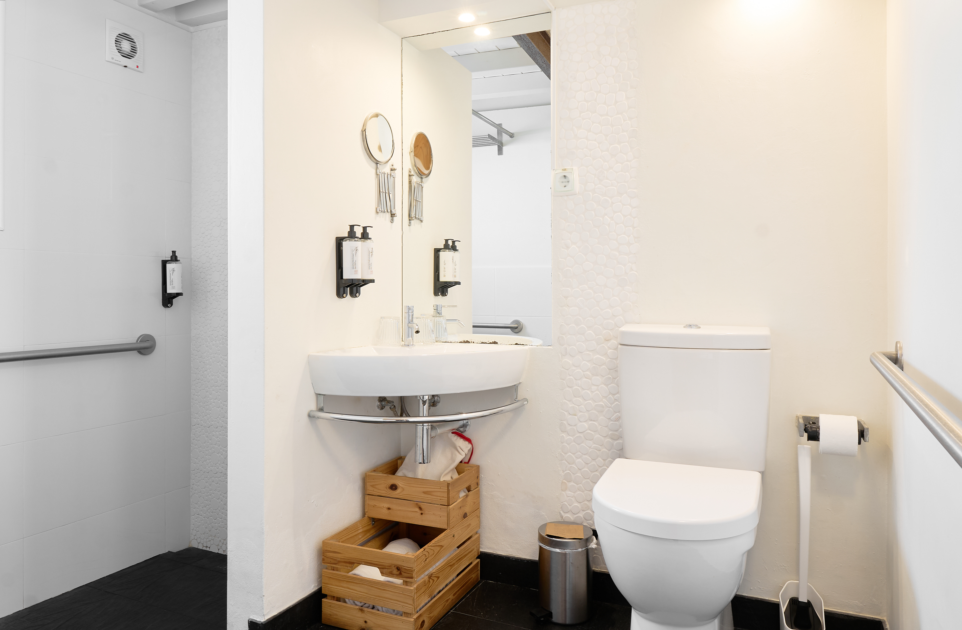 EN - A standout feature of the ground floor is the minimalist vanity unit. This clever design doubles as a sleek desk, paired with round mirrors. I focused on how the natural light from the nearby window interacts with the clean architectural lines of this space, blending utility with high-end aesthetics.