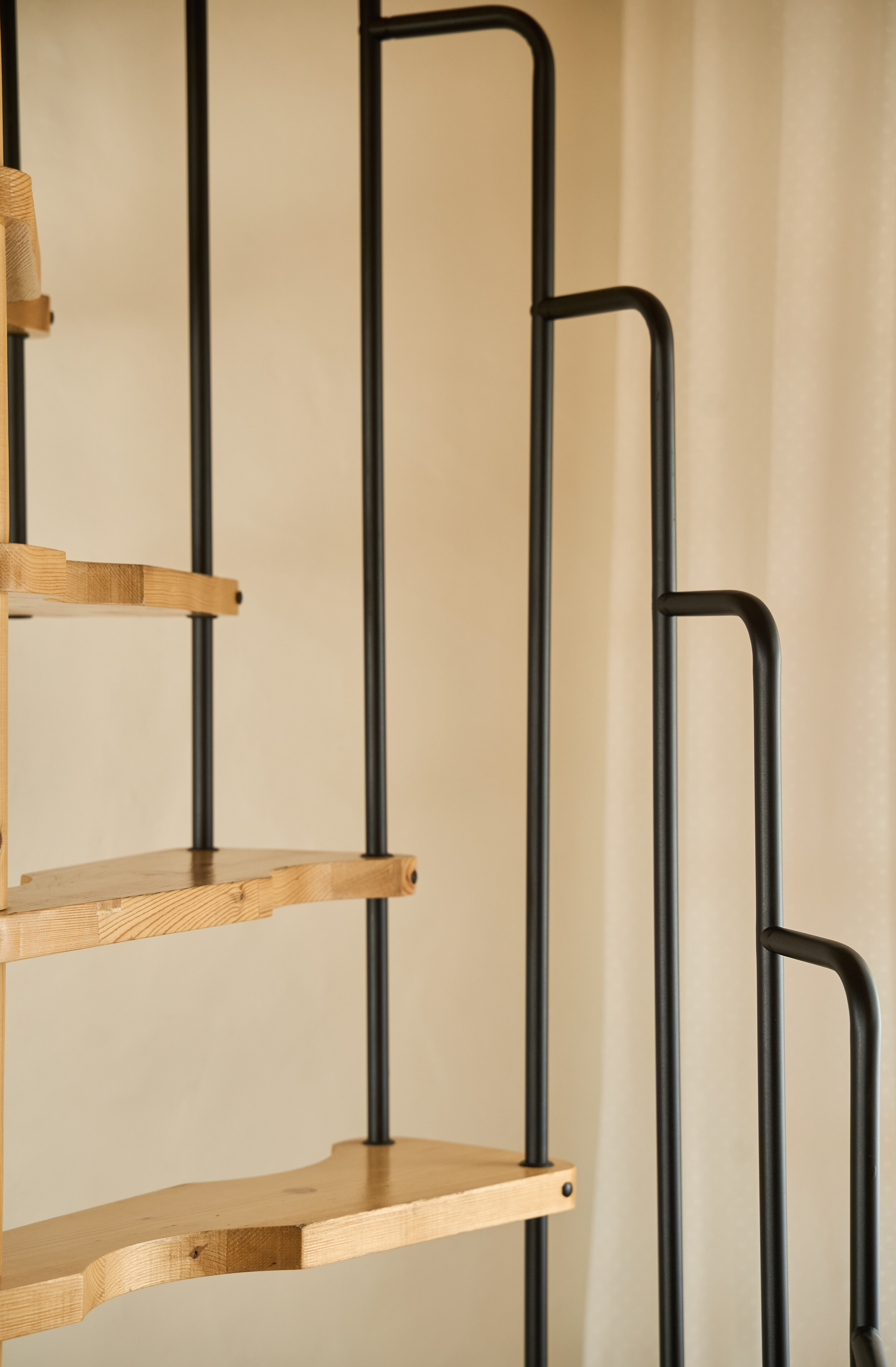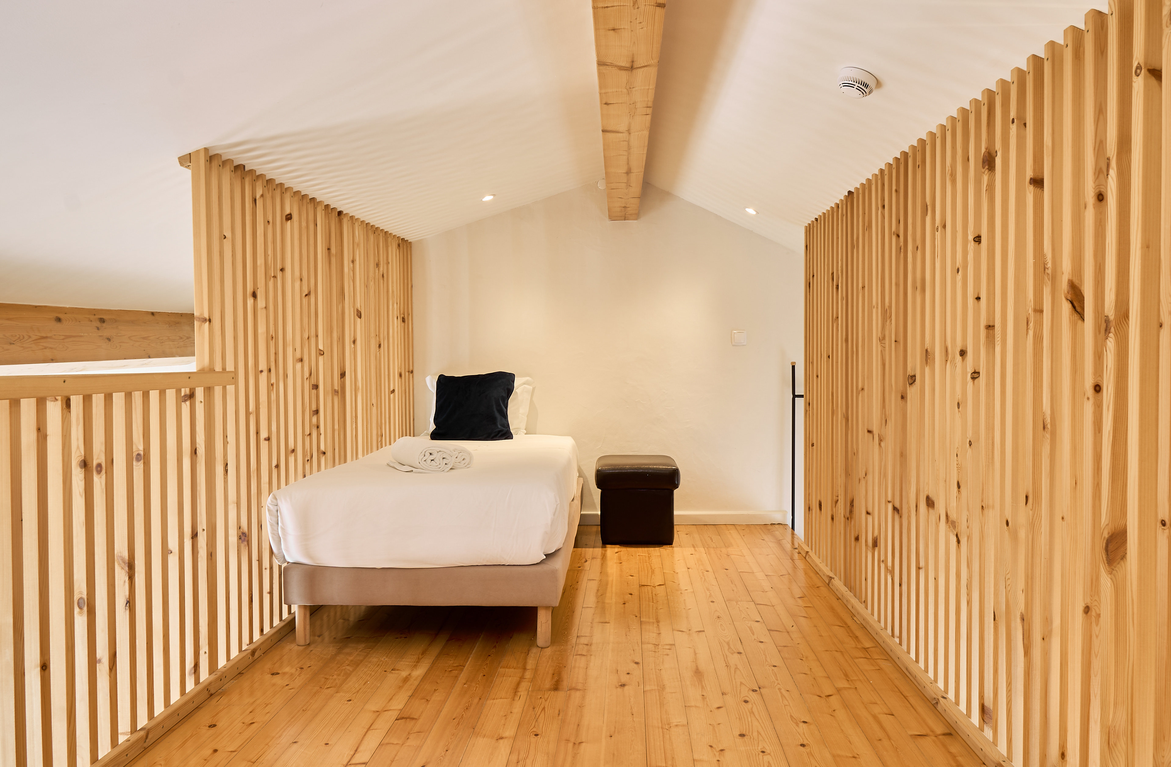 EN - Following the graphic lines of the staircase, the mezzanine reveals a smart use of vertical space. The photography highlights the architectural volume and the intimate atmosphere created by the wood accents and the soft, indirect lighting.