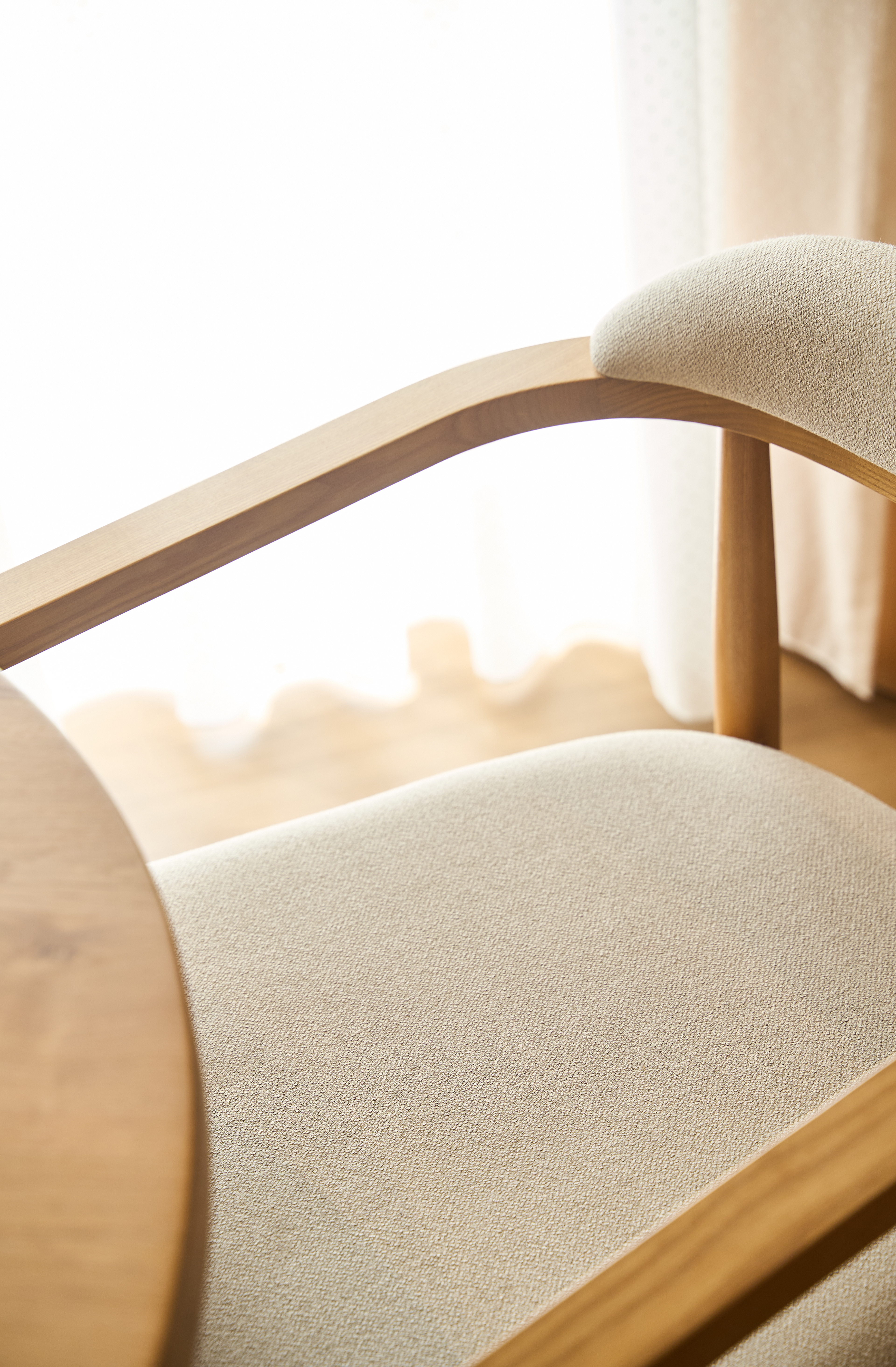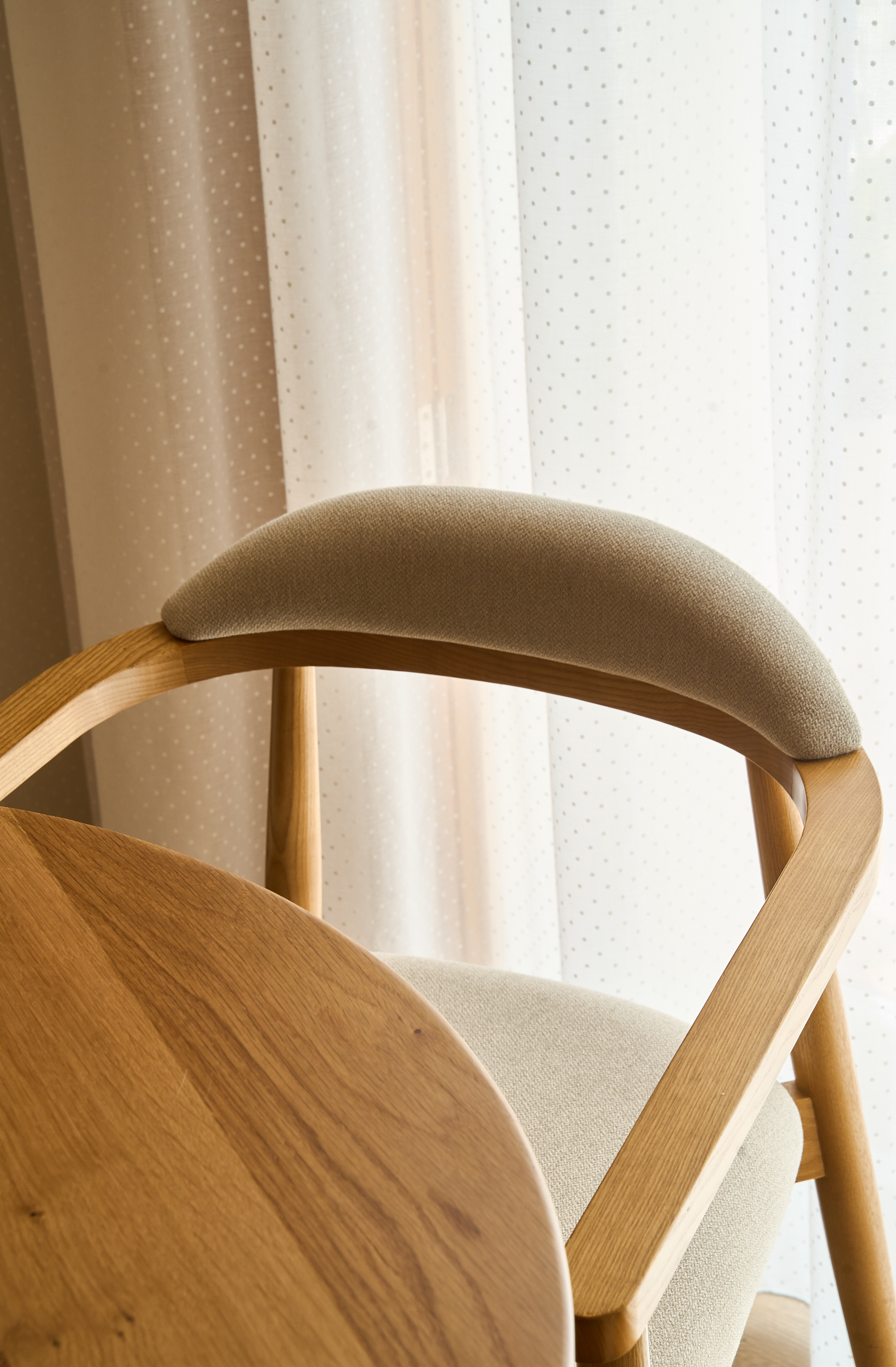 EN - The dining area is perhaps the most graphic space in the house. I was captivated by the silhouette of the designer chairs against the warmth of the solid wood table. My goal was to sculpt these forms using natural light, highlighting the rhythm of the wooden legs and the contemporary lines that anchor the open-plan living area.