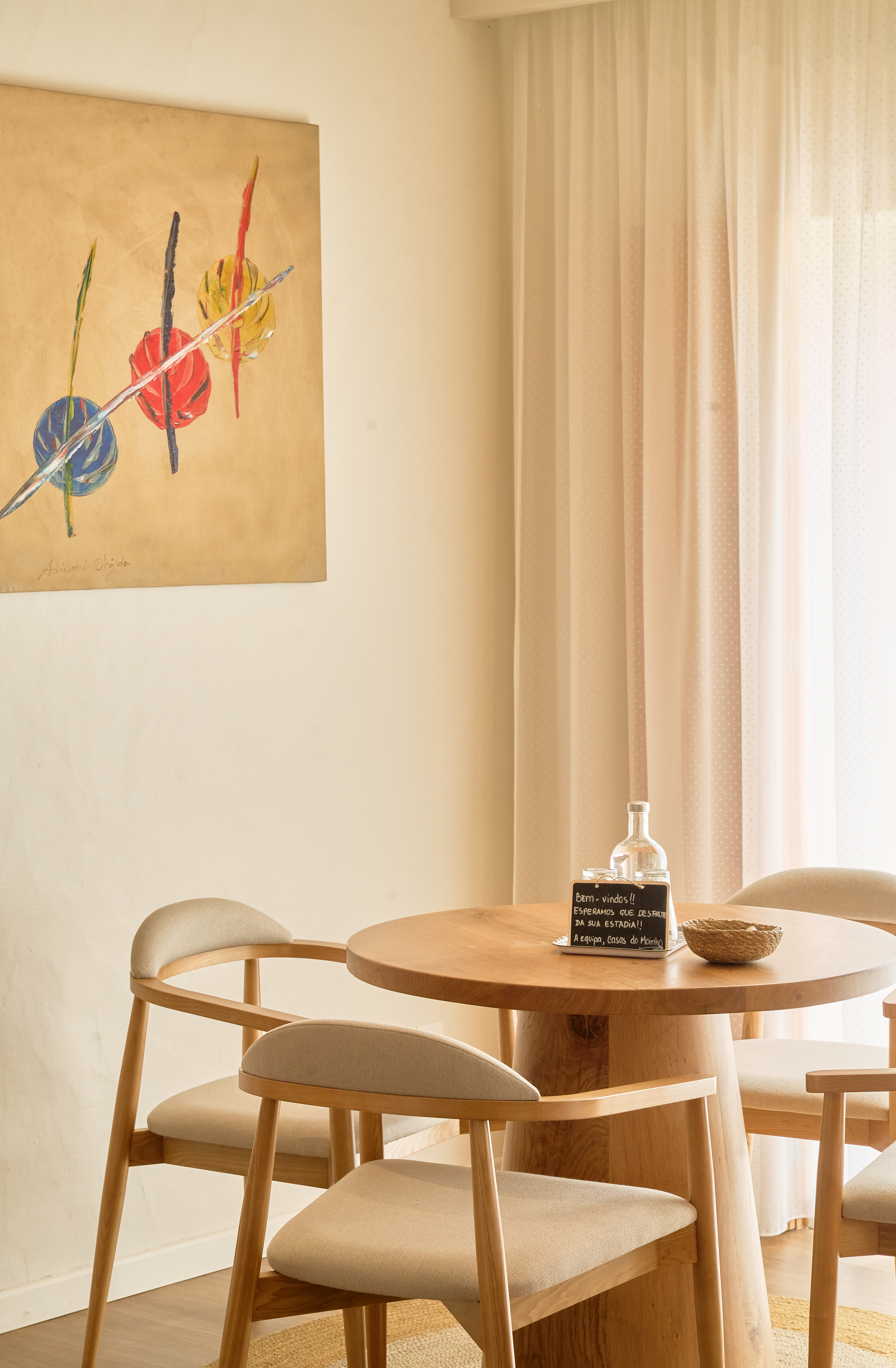 PT - A zona de refeições é, talvez, o espaço mais gráfico da casa. Fiquei cativada pela silhueta das cadeiras de design contra o calor da mesa de madeira maciça. O meu objetivo foi esculpir estas formas utilizando a luz natural, realçando o ritmo das pernas de madeira e as linhas contemporâneas que ancoram a área de estar em plano aberto.