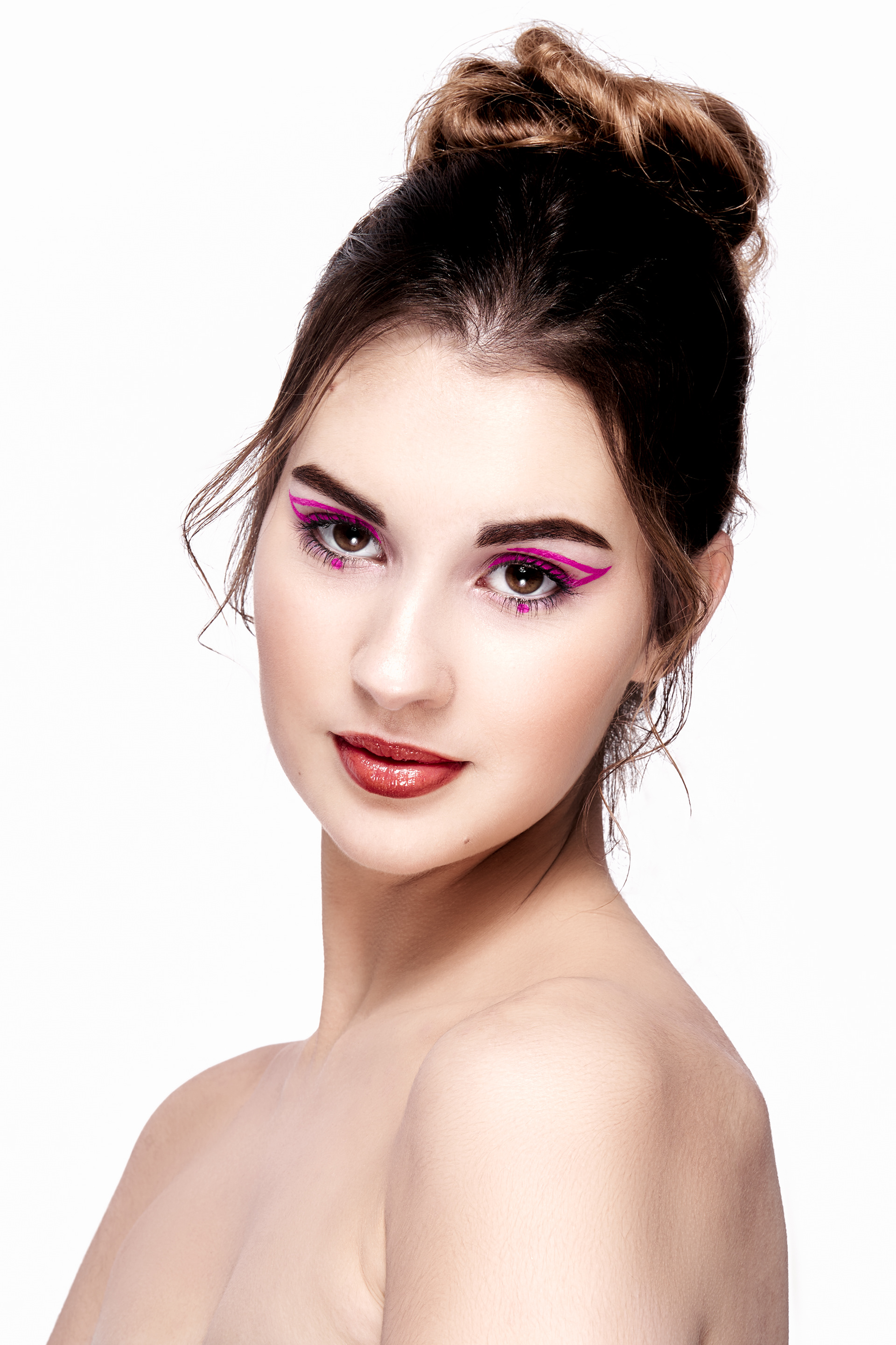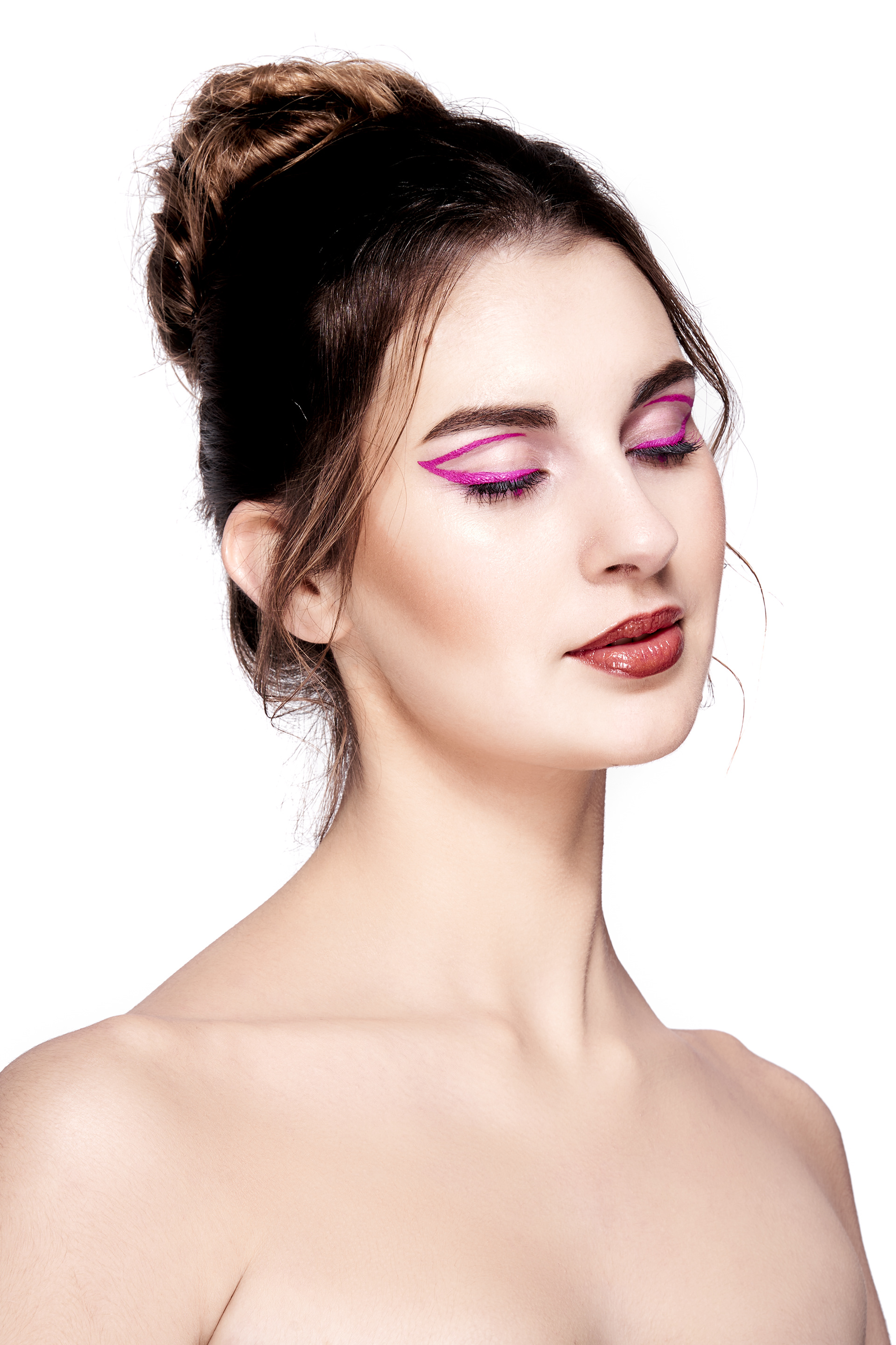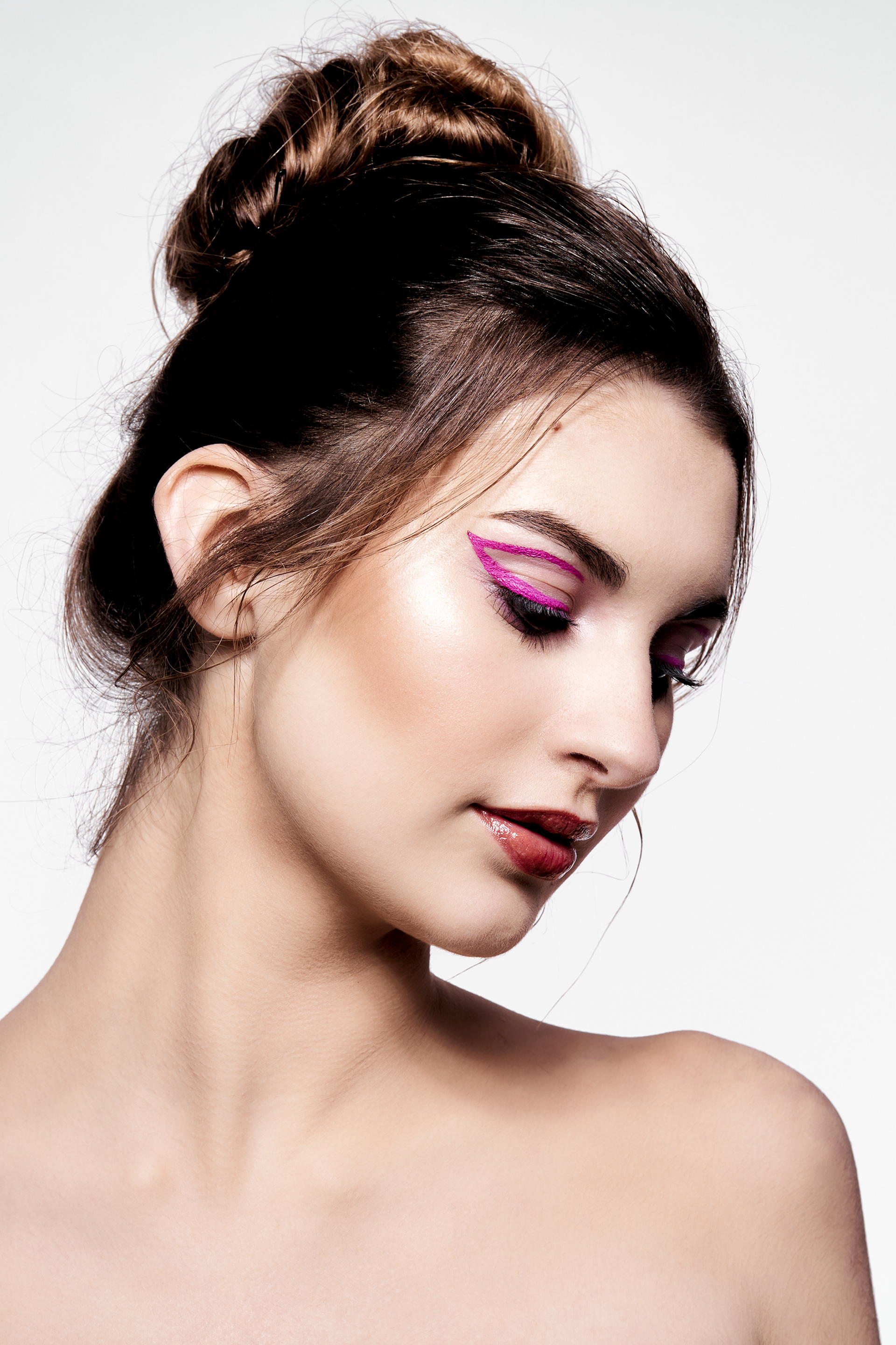 SEO Keywords: Beauty photography, fuchsia liner, pink graphic makeup, effortless high bun, white background studio, minimalist beauty, Algarve photographer.