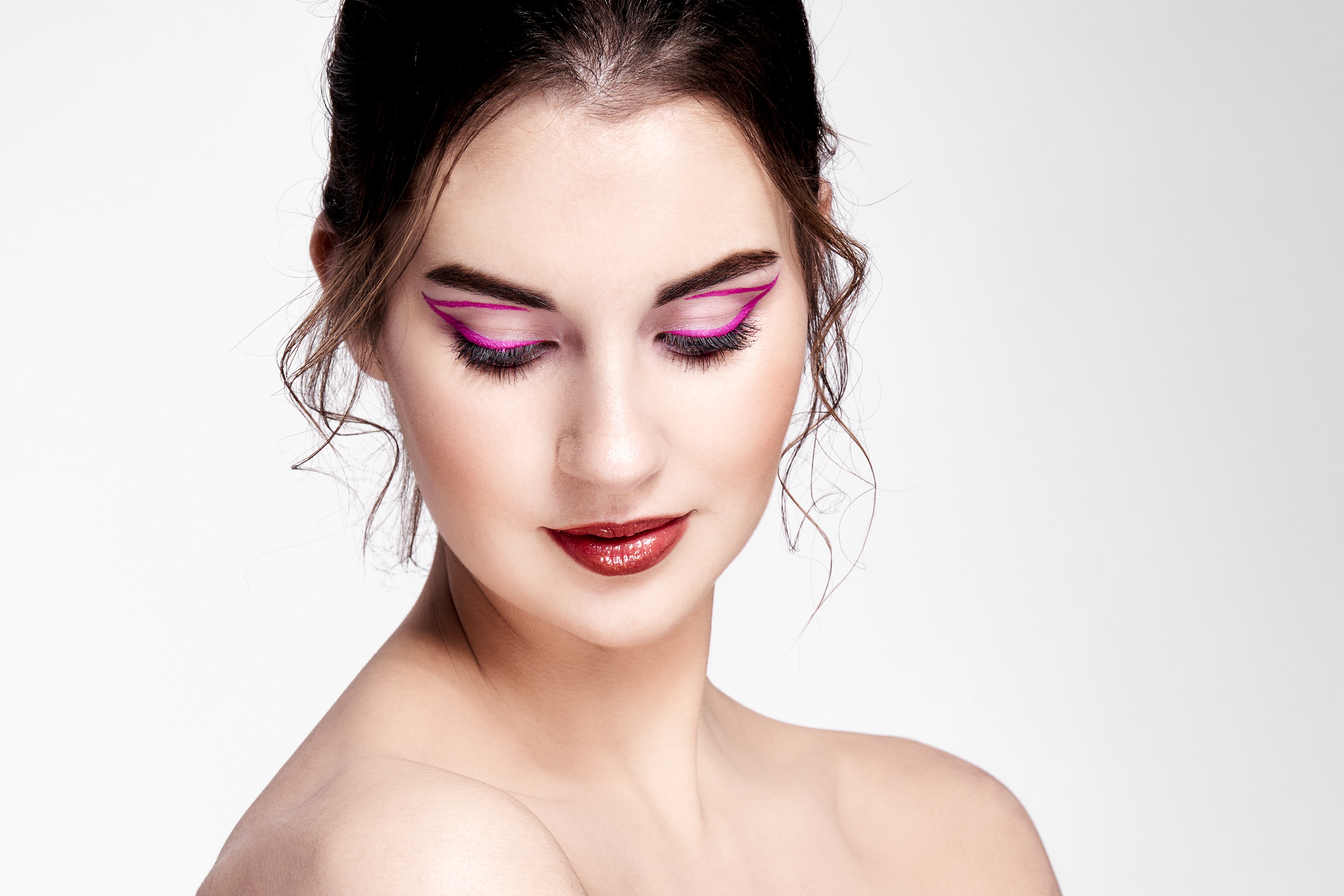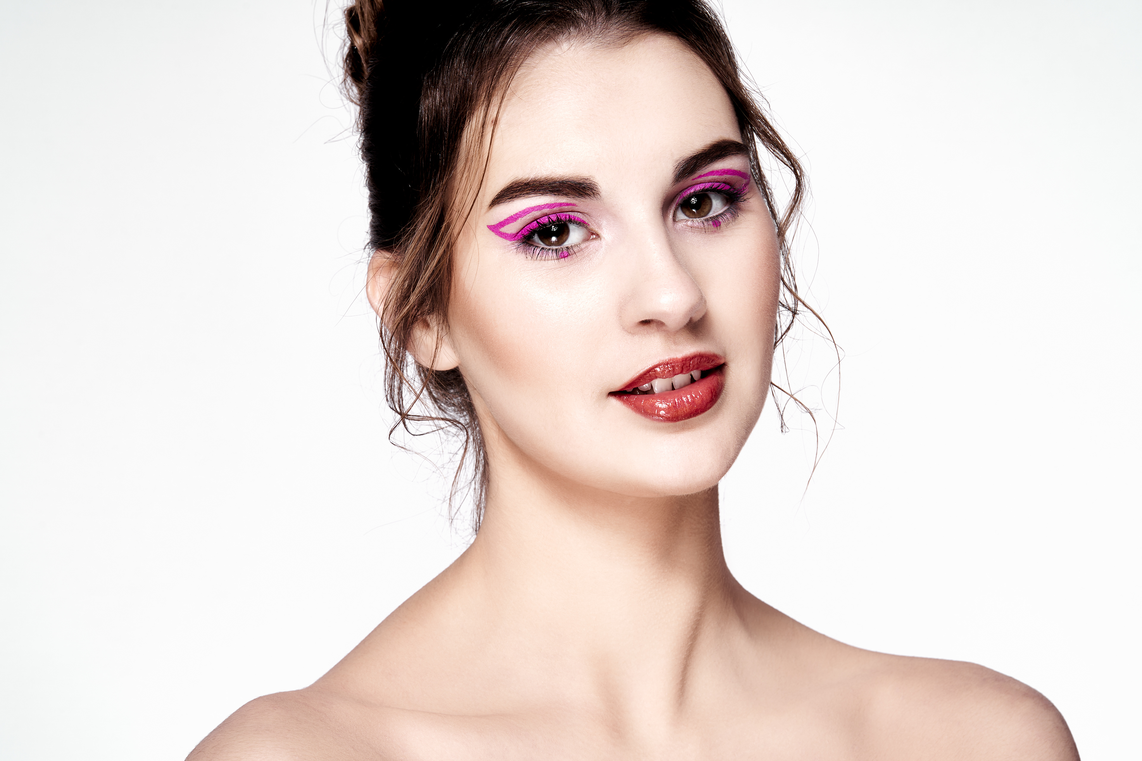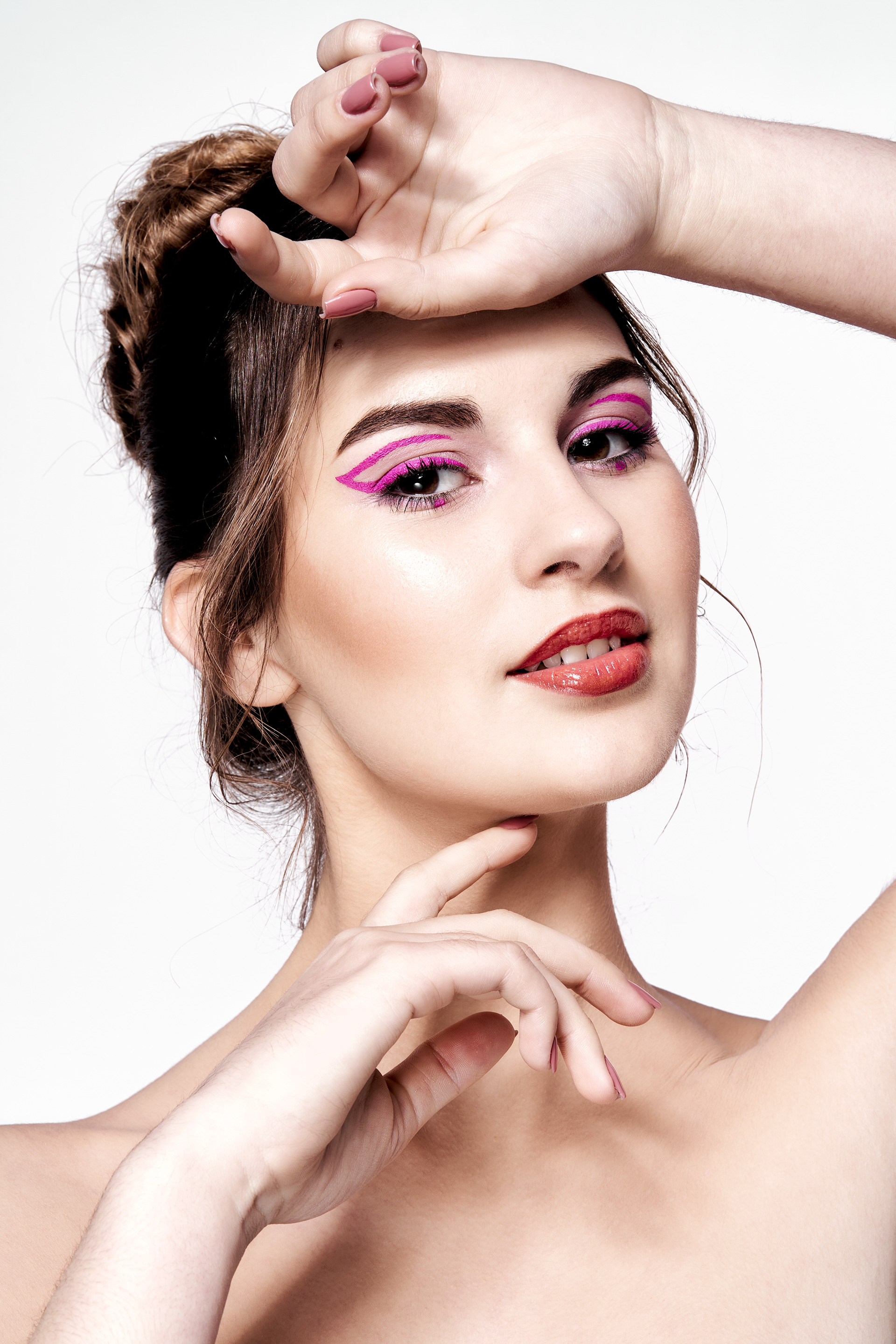 SEO Keywords: Beauty photography, fuchsia liner, pink graphic makeup, effortless high bun, white background studio, minimalist beauty, Algarve photographer.