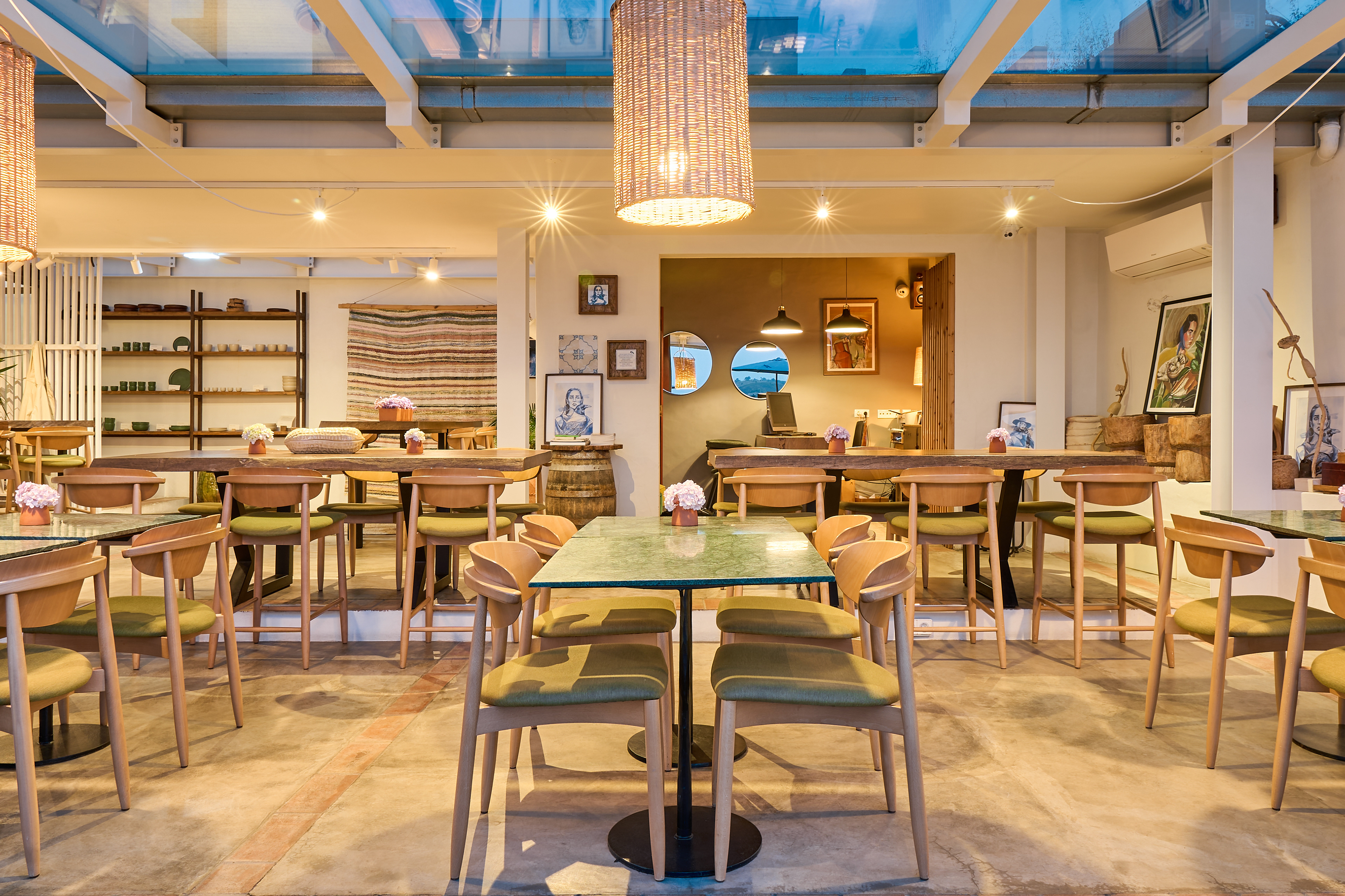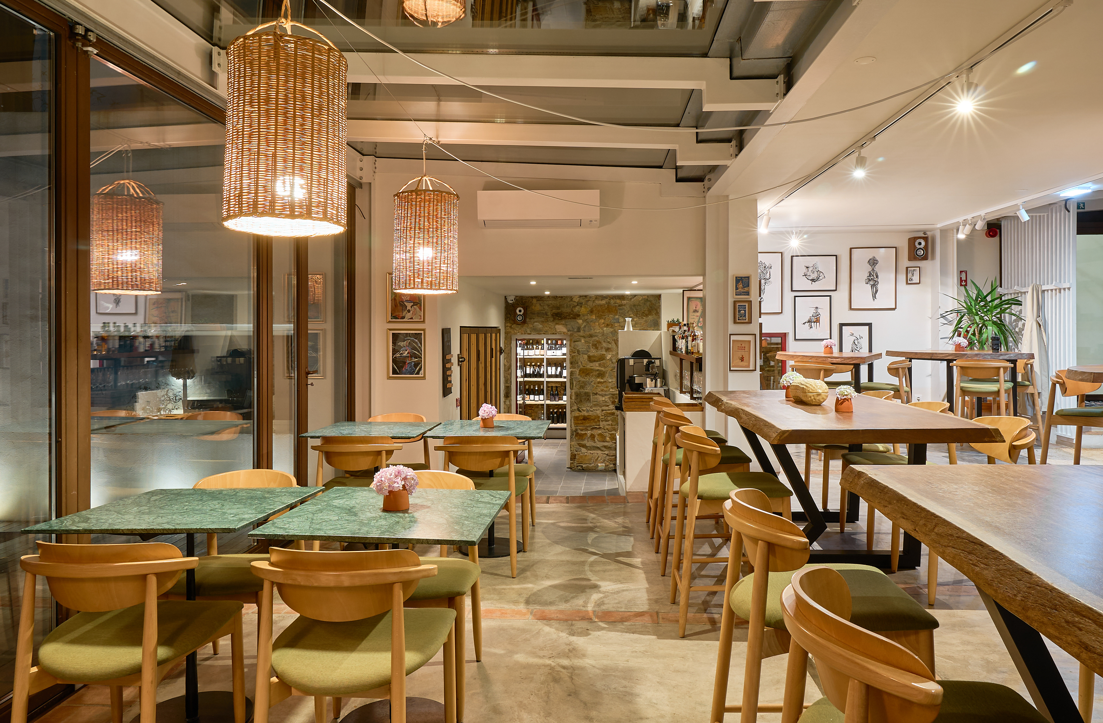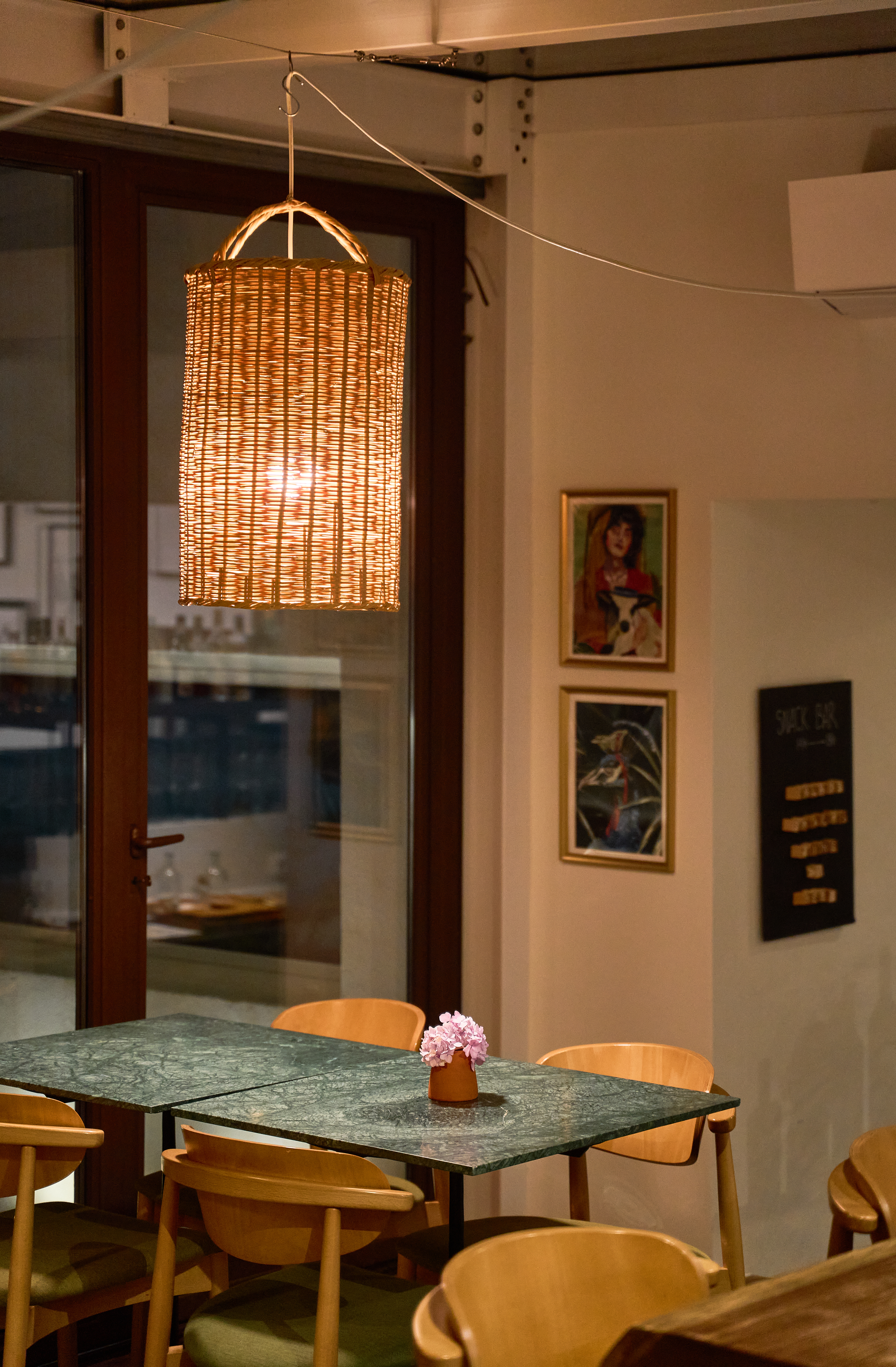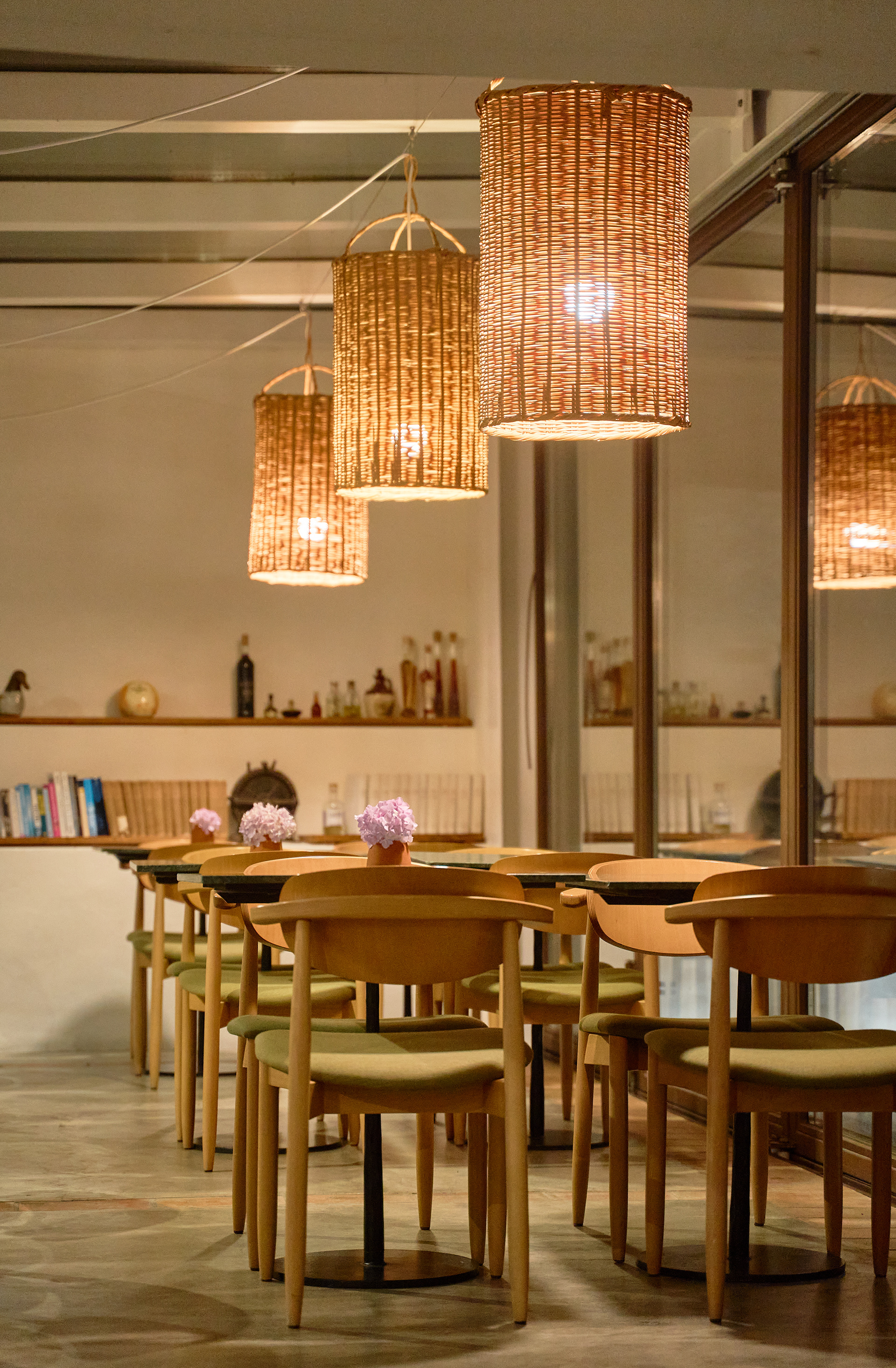 EN - The visual narrative focuses on the dialogue between organic textures and light across the restaurant. The interior relies on a tactile palette where natural cork, solid wood, and woven fibers meet minimalist geometry.