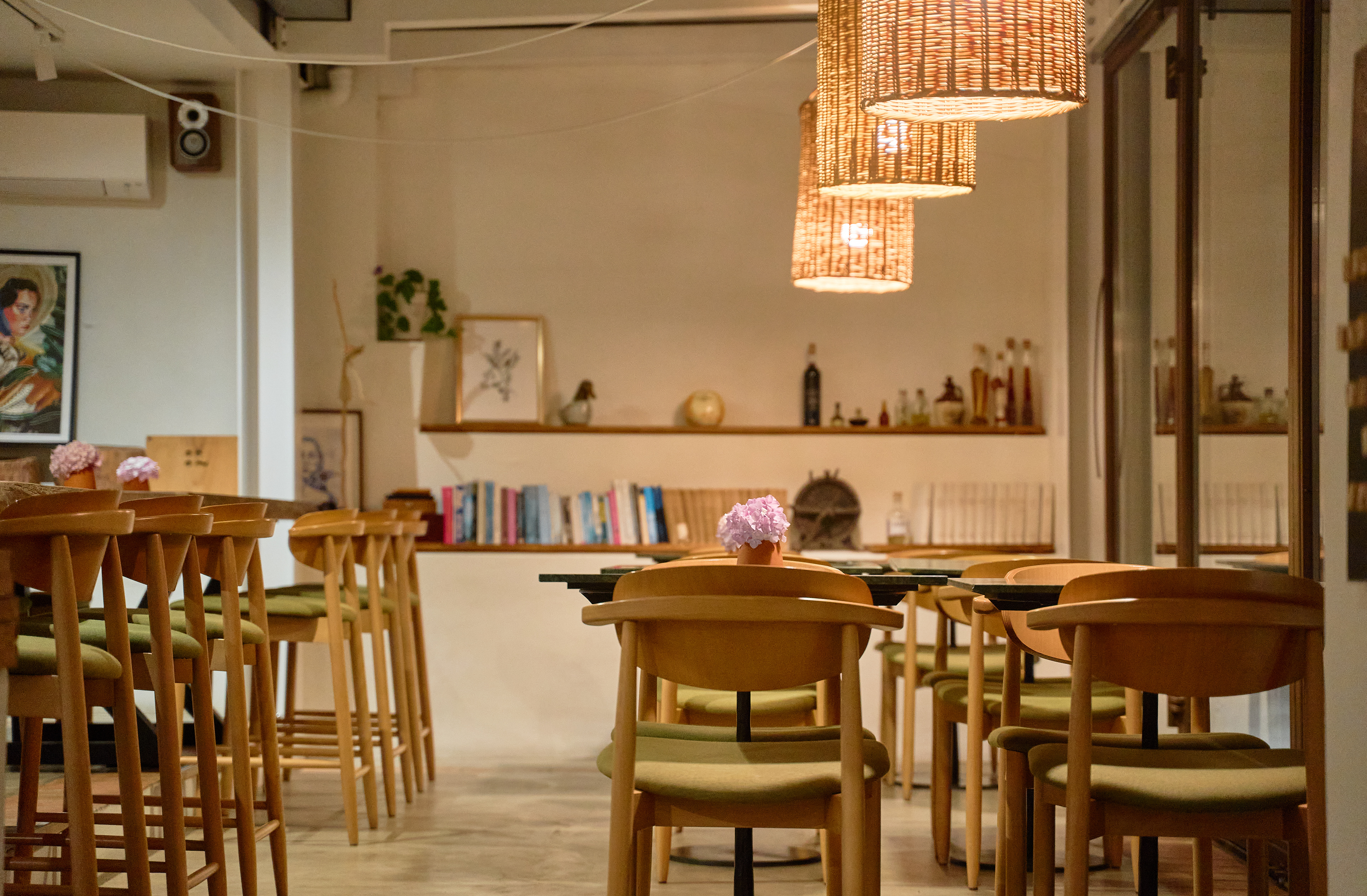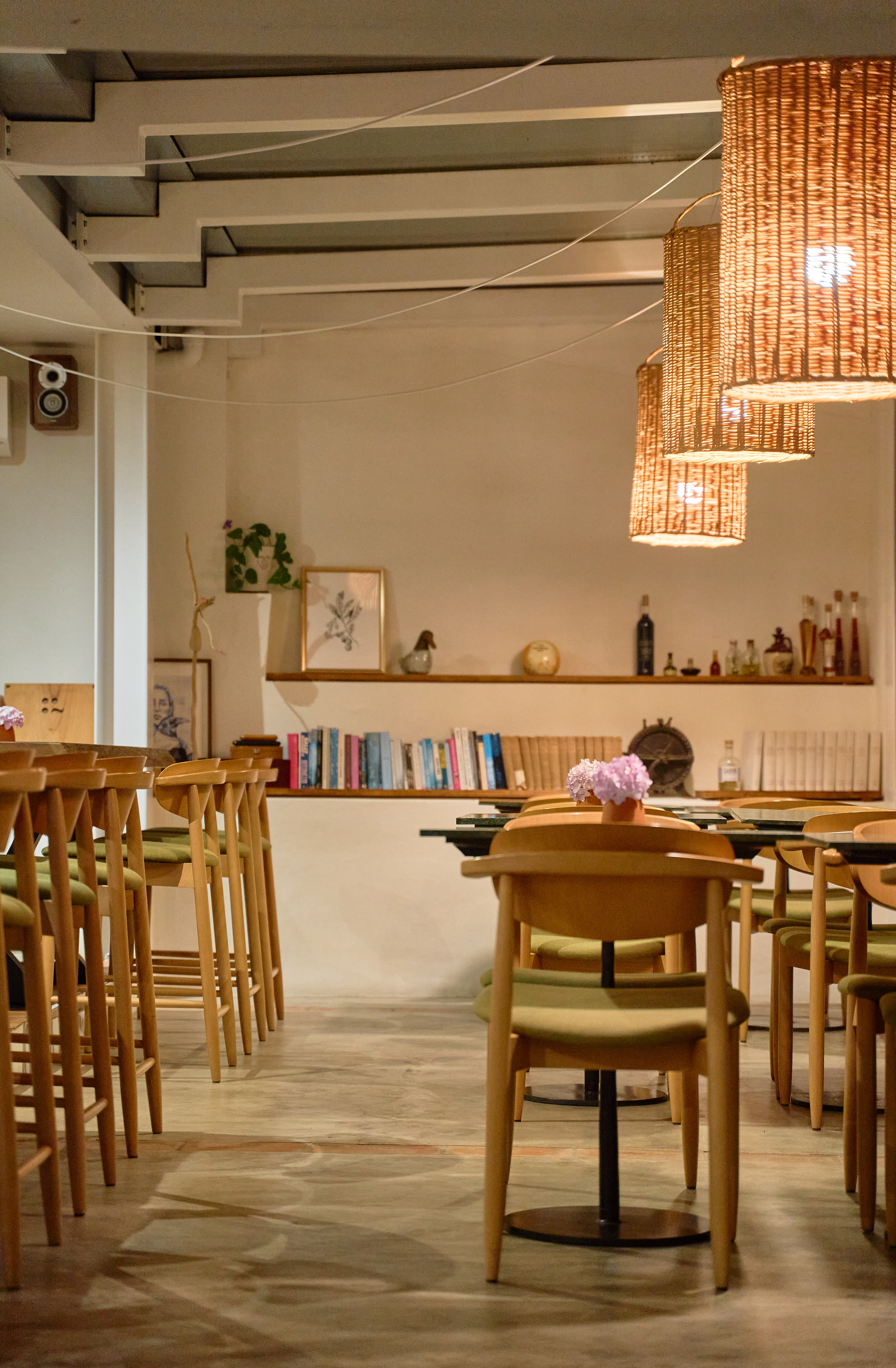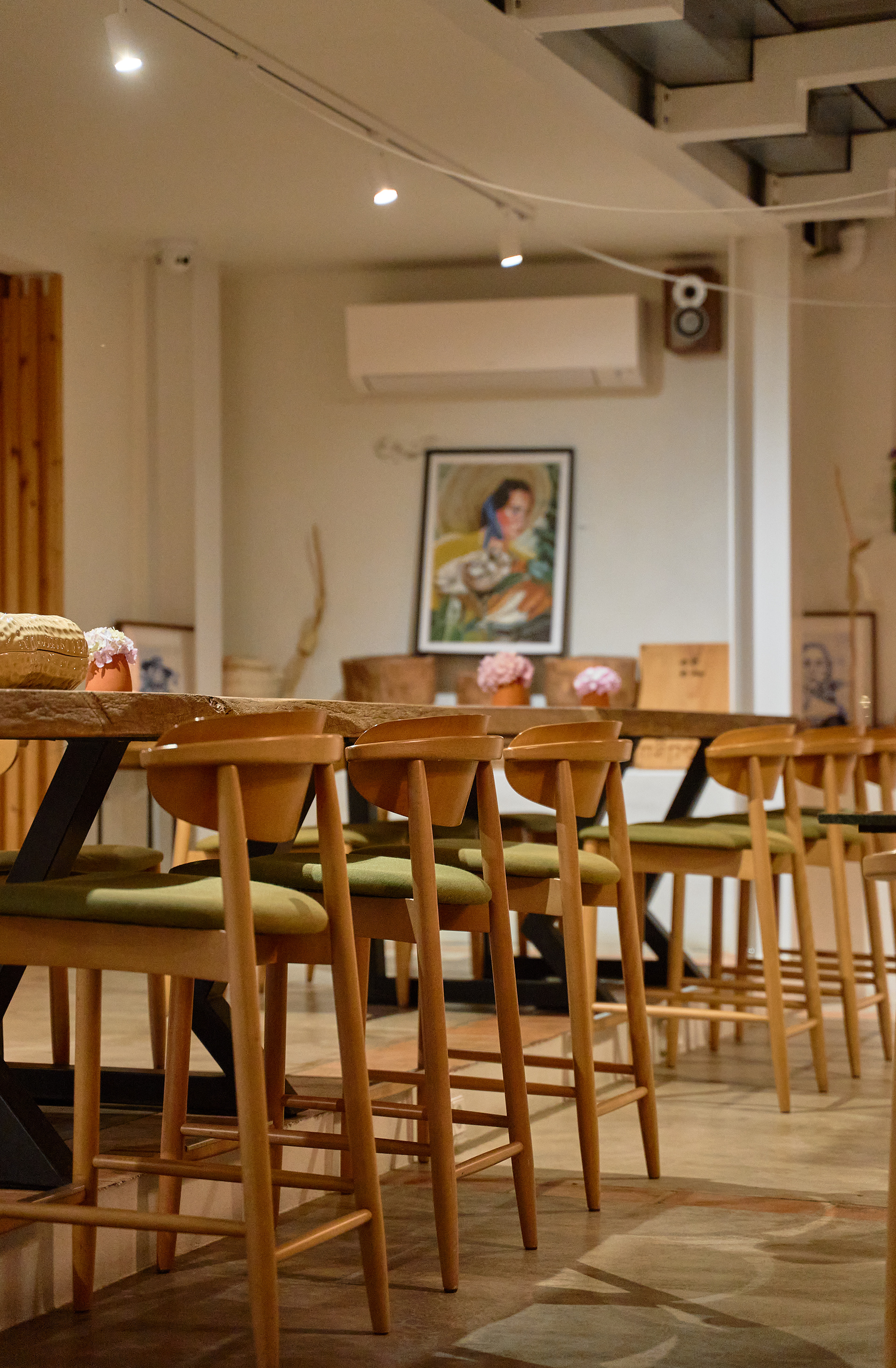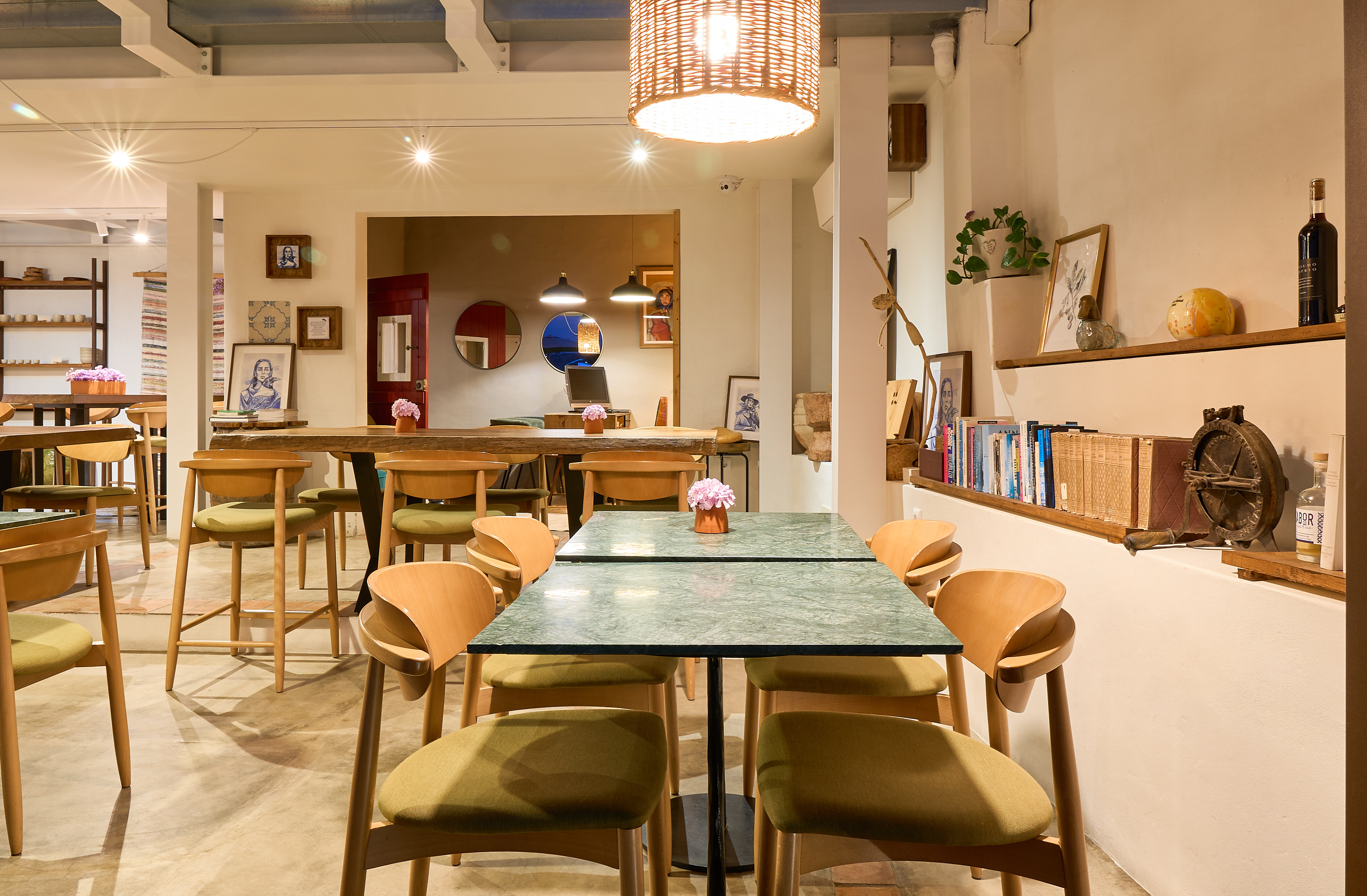 EN - The visual narrative focuses on the dialogue between organic textures and light across the restaurant. The interior relies on a tactile palette where natural cork, solid wood, and woven fibers meet minimalist geometry.